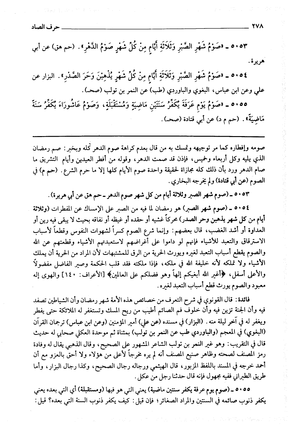 5054 - (صوم شهر الصبر) هو رمضان لما فيه من الصبر على الإمساك عن المفطرات (وثلاثة أيام من كل شهر يذهبن وحر الصدر) محركا غشيه أو حقده أو غيظه أو نفاقه بحيث لا يبقى فيه رين أو العداوة أو أشد الغضب قال بعضهم : وإنما شرع الصوم كسرا لشهوات النفوس وقطعا لأسباب الاسترقاق والتعبد للأشياء فإنهم لو داموا على أغراضهم لاستعبدتهم الأشياء وقطعتهم عن الله والصوم بقط أسباب التعبد لغيره ويورث الحرية من الرق للمشتبهات لأن المراد من الحرية أن يملك الأشياء ولا تملكه لأنه خليفة الله في ملكه فإذا ملكته فقد قلب الحكمة وصير الفاضل مفضولا والأعلى أسفل * (أغير الله أبغيكم إلها وهو فضلكم على العالمين) * والهوى إله معبود والصوم يورث قطع أسباب التعبد لغيره.
