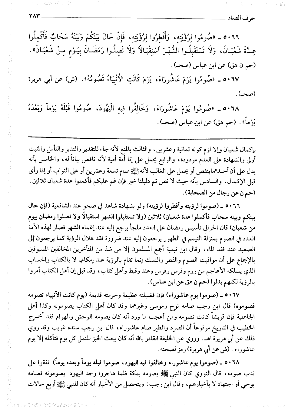 5066 - (صوموا لرؤيته وأفطروا لرؤيته) ولو بشهادة شاهد في صحو عند الشافعية (فإن حال بينكم وبينه سحاب فأكملوا عدة شعبان) ثلاثين (ولا تستقبلوا الشهر استقبالا ولا تصلوا رمضان بيوم من شعبان) قال الحرالي : تأسيس رمضان على العدد ملجأ يرجع إليه عند إغماء الشهر فصار لهذه الأمة العدد في الصوم بمنزلة التيمم في الطهور يرجعون إليه عند ضرورة فقد هلال الرؤية كما يرجعون إلى الصعيد عند فقد الماء وقال ابن تيمية : أجمع المسلمون إلا من شذ من المتأخرين المخالفين المسبوقين بالإجماع على أن مواقيت الصوم والفطر والنسك إنما تقام الرؤية عند إمكانها لا بالكتاب والحساب الذي يسلكه الأعاجم من روم وفرس وهند وقبط وأهل كتاب وقد قيل إن أهل الكتاب أمروا بالرؤية لكنهم بدلوا.