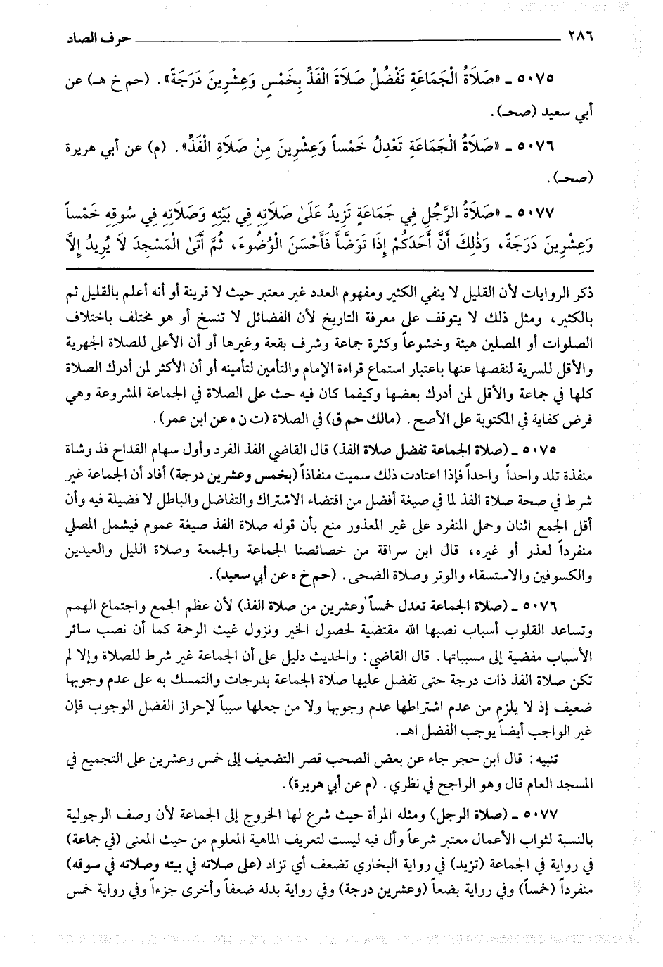 5076 - (صلاة الجماعة تعدل خمسا وعشرين من صلاة الفذ) لأن عظم الجمع واجتماع الهمم وتساعد القلوب أسباب نصبها الله مقتضية لحصول الخير ونزول غيث الرحمة كما أن نصب سائر الأسباب مفضية إلى مسبباتها.