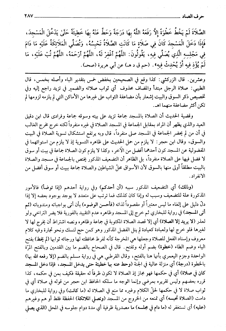 وعشرين قال الزركشي : كذا وقع في الصحيحين بخفض خمس بتقدير الباء وأصله بخمس قال الطيبي : صلاة الرجل مبتدأ والمضاف محذوف أي ثواب صلاته والضمير في تزيد راجع إليه وفي تخصيص ذكر السوق والبيت إشعار بأن مضاعفة الثواب على غيرها من الأماكن التي لم يلزمه لزومها لم تكن أكثر مضاعفة منهما اه.