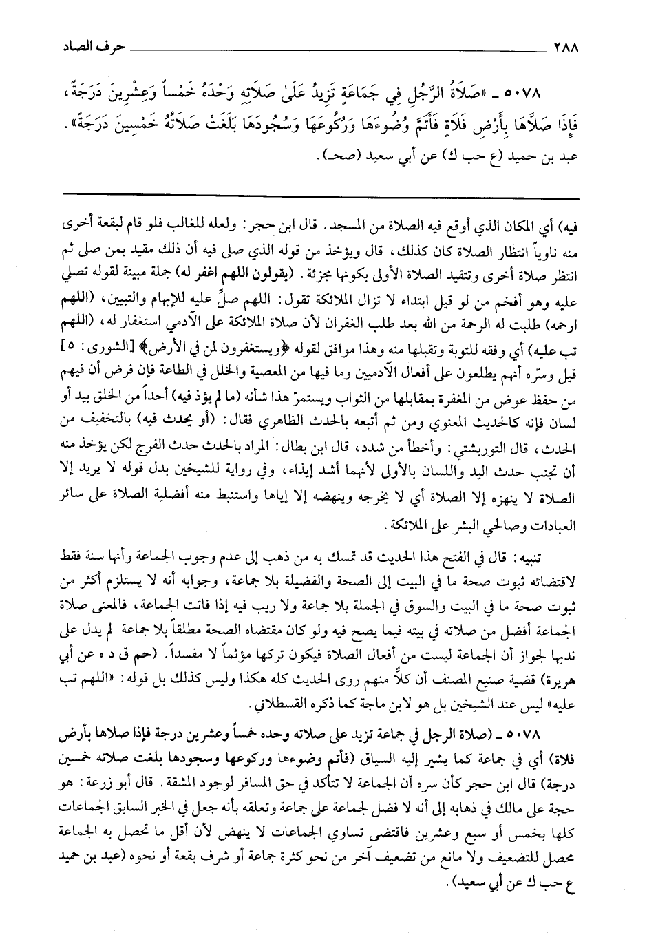 5078 - (صلاة الرجل في جماعة تزيد على صلاته وحده خمسا وعشرين درجة فإذا صلاها بأرض فلاة) أي في جماعة كما يشير إليه السياق (فأتم وضوءها وركوعها وسجودها بلغت صلاته خمسين درجة) قال ابن حجر : كأن سره أن الجماعة لا تتأكد في حق المسافر لوجود المشقة قال أبو زرعة : هو حجة على مالك في ذهابه إلى أنه لا فضل لجماعة على جماعة وتعلقه بأنه جعل في الخبر السابق الجماعات كلها بخمس أو سبع وعشرين فاقتضى تساوي الجماعات لا ينهض لأن أقل ما تحصل به الجماعة محصل للتضعيف ولا مانع من تضعيف آخر من نحو كثرة جماعة أو شرف بقعة أو نحوه.