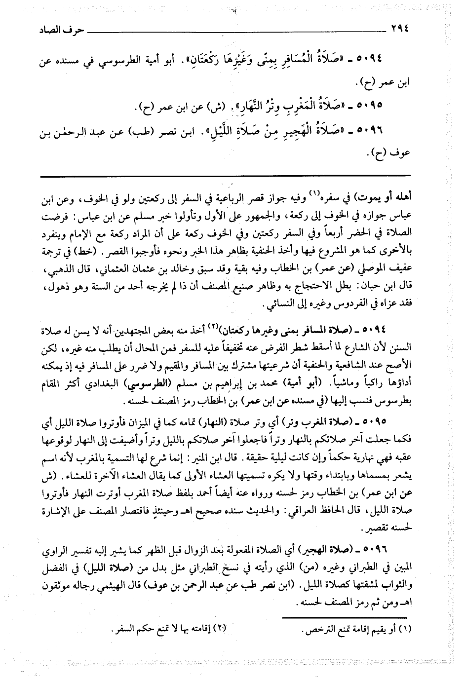5094 - (صلاة المسافر بمنى وغيرها ركعتان) (1) أخذ منه بعض المجتهدين أنه لا يسن له صلاة السنن لأن الشارع لما أسقط شطر الفرض عنه تخفيفا عليه للسفر فمن المحال أن يطلب منه غيره لكن الأصح عند الشافعية والحنفية أن شرعيتها مشترك بين المسافر والمقيم ولا ضرر على المسافر فيه إذ يمكنه أداؤها راكبا وماشيا.