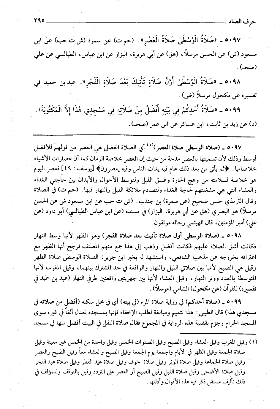 5097 - (صلاة الوسطى صلاة العصر (1) أي الصلاة الفضلى هي العصر من قولهم للأفضل أوسط وذلك لأن تسميتها بالعصر مدحة من حيث إن العصر خلاصة الزمان كما أن عصارات الأشياء خلاصاتها * (ثم يأتي من بعد ذلك عام فيه يغاث الناس وفيه يعصرون) * فعصر اليوم هو خلاصة لسلامته من وهج الحارة وغسق الليل ولتوسط الأحوال والأبدان بين حاجتي الغداء والعشاء التي هي مشغلتهم لحاجة الغداء ولتصادم ملائكة الليل والنهار فيها.