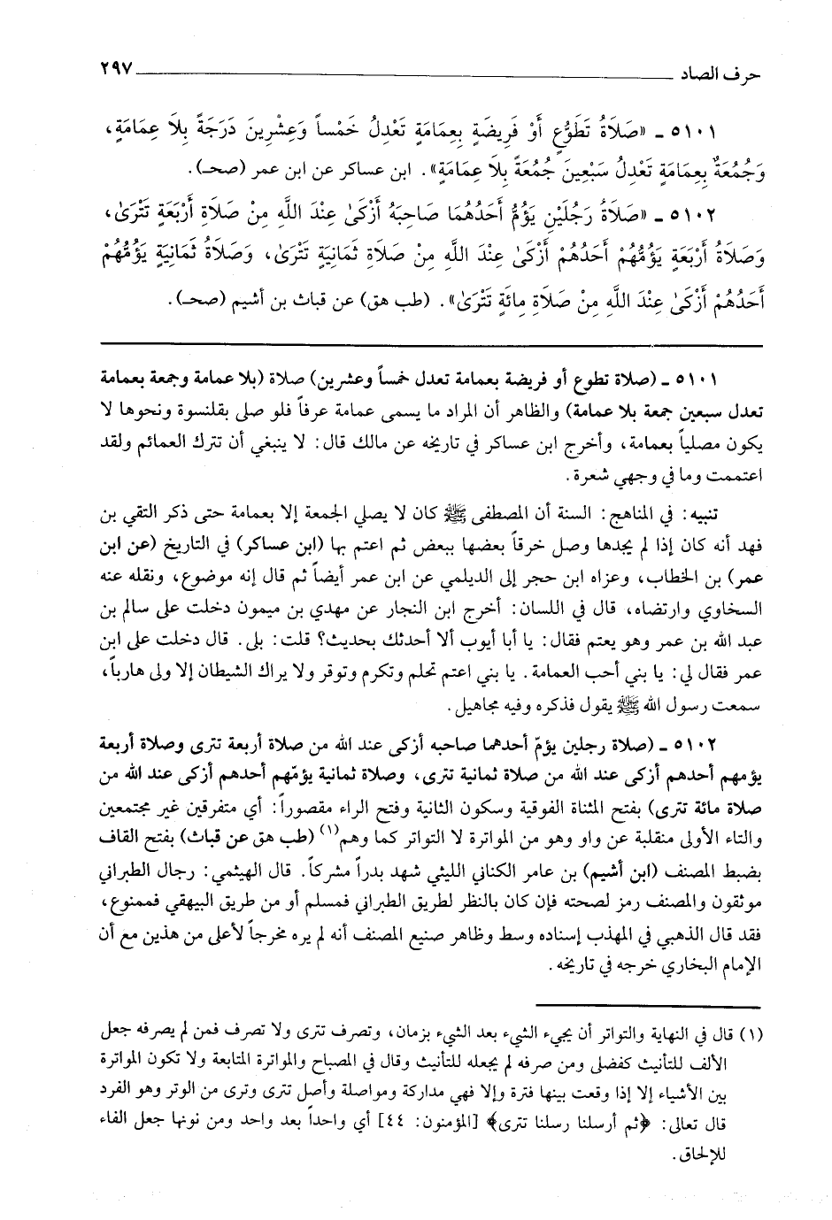 5101 - (صلاة تطوع أو فريضة بعمامة تعدل خمسا وعشرين صلاة بلا عمامة وجمعة بعمامة تعدل سبعين جمعة بلا عمامة) والظاهر أن المراد ما يسمى عمامة عرفا فلو صلى بقلنسوة ونحوها لا يكون مصليا بعمامة وأخرج ابن عساكر في تاريخه عن مالك قال : لا ينبغي أن تترك العمائم ولقد اعتممت وما في وجهي شعرة (تنبيه) في المناهج : السنة أن المصطفى صلى الله عليه وسلم كان لا يصلي الجمعة إلا بعمامة حتى ذكر التقي بن فهد أنه كان إذا لم يجدها وصل خرقا بعضها ببعض ثم اعتم بها.