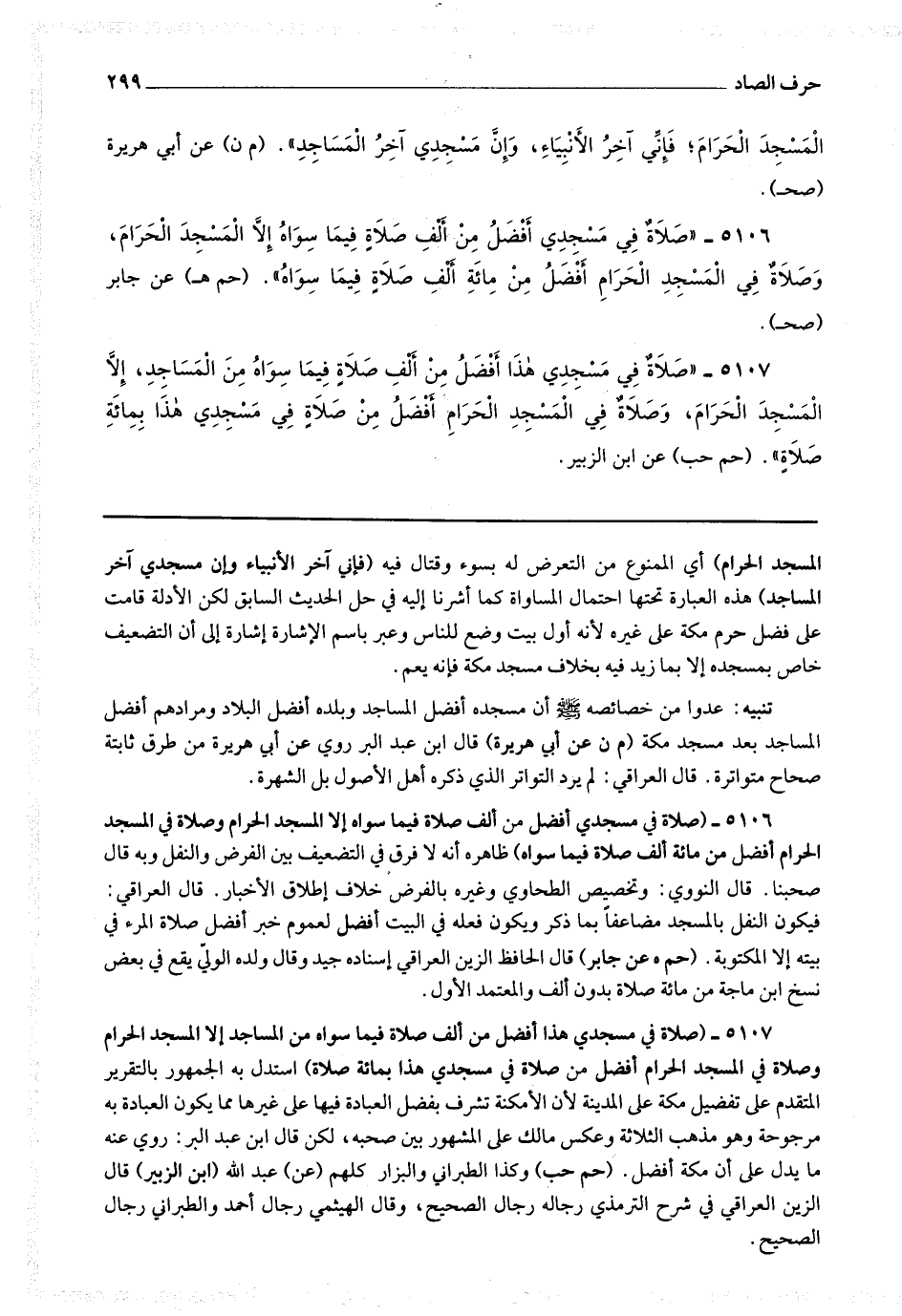 5107 - (صلاة في مسجدي هذا أفضل من ألف صلاة فيما سواه من المساجد إلا المسجد الحرام وصلاة في المسجد الحرام أفضل من صلاة في مسجدي هذا بمائة صلاة) استدل به الجمهور بالتقرير المتقدم على تفضيل مكة على المدينة لأن الأمكنة تشرف بفضل العبادة فيها على غيرها مما يكون العبادة به مرجوحة وهو مذهب الثلاثة وعكس مالك على المشهور بين صحبه لكن قال ابن عبد البر : روى عنه ما يدل على أن مكة أفضل.