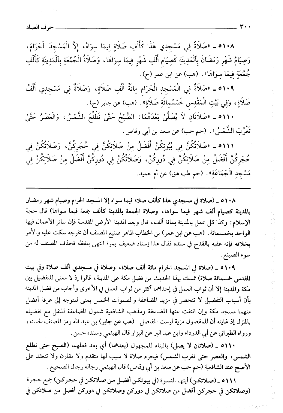 5108 - (صلاة في مسجدي هذا كألف صلاة فيما سواه إلا المسجد وصيام شهر رمضان بالمدينة كصيام ألف شهر فيما سواها وصلاة الجمعة بالمدينة كألف جمعة فيما سواها) قال حجة الإسلام : وكذا كل عمل بالمدينة بمائة ألف قال : وبعد المدينة الأرض المقدسة فإن سائر الأعمال فيها الواحد بخمسمائة.