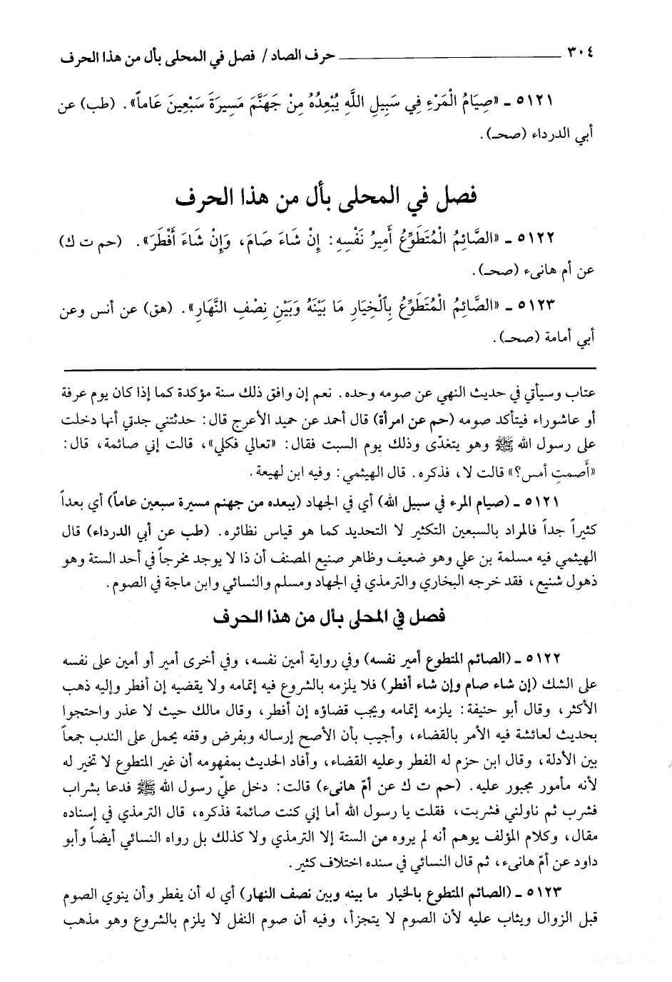 5122 - (الصائم المتطوع أمير نفسه) وفي رواية أمين نفسه وفي أخرى أمير أو أمين على نفسه على الشك (إن شاء صام وإن شاء أفطر) فلا يلزمه بالشروع فيه إتمامه ولا يقضيه إن أفطر وإليه ذهب الأكثر وقال أبو حنيفة (1): يلزمه إتمامه ويجب قضاؤه إن أفطر، وقال مالك: حيث لا عذر، واحتجوا بحديث لعائشة، فيه الأمر بالقضاء، وأجيب بأن الأصح إرساله وبفرض وقفه يحمل على الندب جمعا بين الأدلة وقال ابن حزم: له الفطر وعليه القضاء وأفاد الحديث بمفهومه أن غير المتطوع لا تخير له
