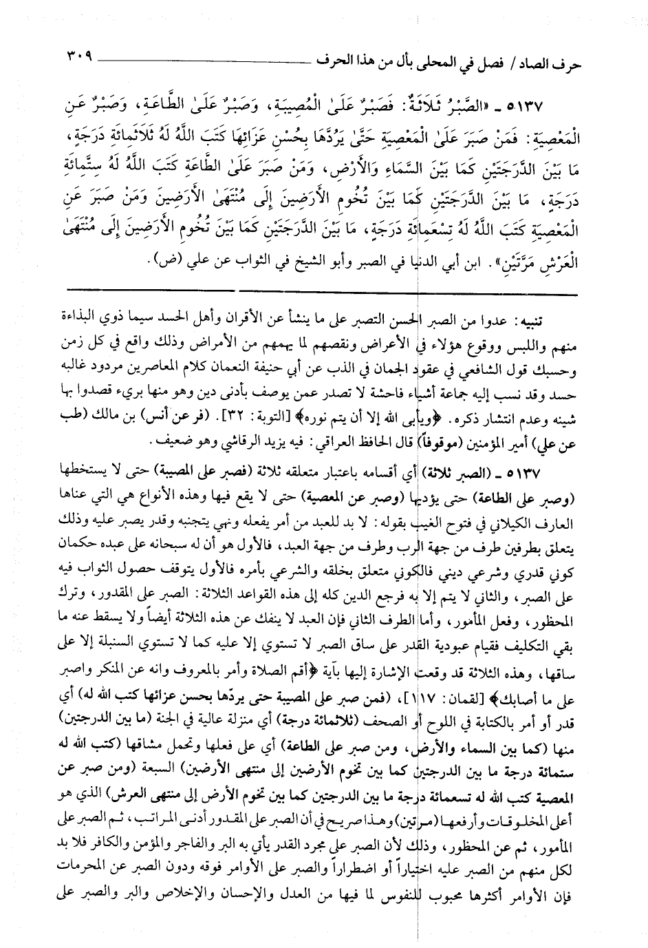 5137 - (الصبر ثلاثة) أي أقسامه باعتبار متعلقه ثلاثة (فصبر على المصيبة) حتى لا يستخطها (وصبر على الطاعة) حتى يؤديها (وصبر على المعصية) حتى لا يقع فيها وهذه الأنواع هي التي عناها العارف الكيلاني في فتوح الغيب بقوله لا بد للعبد من أمر يفعله ونهي بتجنبه وقدر يصبر عليه وذلك يتعلق بطرفين طرف من جهة الرب وطرف من جهة العبد فالأول هو أن له سبحانه على عبده حكمان كوني قدري وشرعي ديني فالكوني متعلق بخلقه والشرعي بأمره فالأول يتوقف حصول الثواب فيه على الصبر والثاني لا يتم إلا به فرجع الدين كله إلى هذه القواعد الثلاثة الصبر على المقدور وترك المحظور وفعل المأمور وأما الطرف الثاني فإن العبد لا ينفك عن هذه الثلاثة أيضا ولا يسقط عنه ما بقي التكليف فقيام عبودية القدر على ساق الصبر لا تستوي إلا عليه كما لا تستوي السنبلة إلا على ساقها وهذه الثلاثة قد وقعت الإشارة إليها بآية * (أقم الصلاة وأمر بالمعروف وانه عن المنكر واصبر على ما أصابك) * (فمن صبر على المصيبة حتى يردها بحسن عزائها كتب الله له) أي قدر أو أمر بالكتابة في اللوح أو الصحف (ثلاثمائة درجة) أي منزلة عالية في الجنة (ما بين الدرجتين) منها (كما بين السماء والأرض ومن صبر على الطاعة) أي على فعلها وتحمل مشاقها (كتب الله له ستمائة درجة ما بين الدرجتين كما بين تخوم الأرضين إلى منتهى الأرضين) السبعة (ومن صبر عن المعصية كتب الله له تسعمائة درجة ما بين الدرجتين كما بين تخوم الأرض إلى منتهى العرش) الذي هو أعلى المخلوقات وأرفعها (مرتين) وهذا صريح في أن الصبر على المقدور أدنى المراتب ثم الصبر على المأمور ثم عن المحظور وذلك لأن الصبر على مجرد القدر يأتي به البر والفاجر والمؤمن والكافر فلا بد لكل منهم من الصبر عليه اختيارا أو اضطرارا والصبر على الأوامر فوقه ودون الصبر عن المحرمات