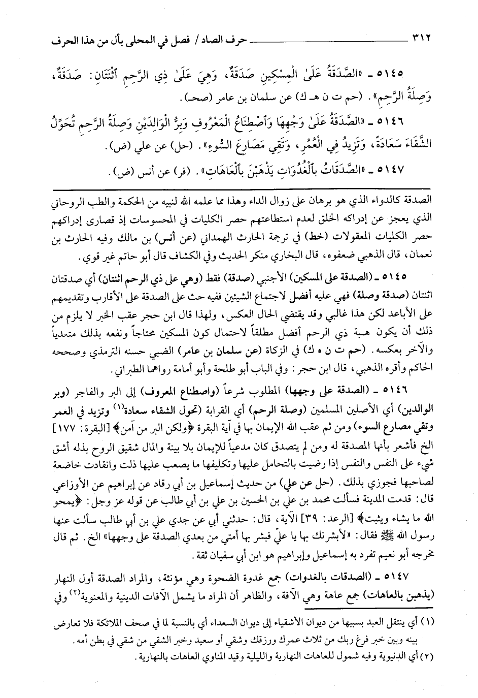 5147 - (الصدقات بالغدوات) جمع غدوة الضحوة وهي مؤنثة والمراد الصدقة أول النهار (يذهبن بالعاهات) جمع عاهة وهي الآفة والظاهر أن المراد ما يشمل الآفات الدينية والمعنوية (1) وفي