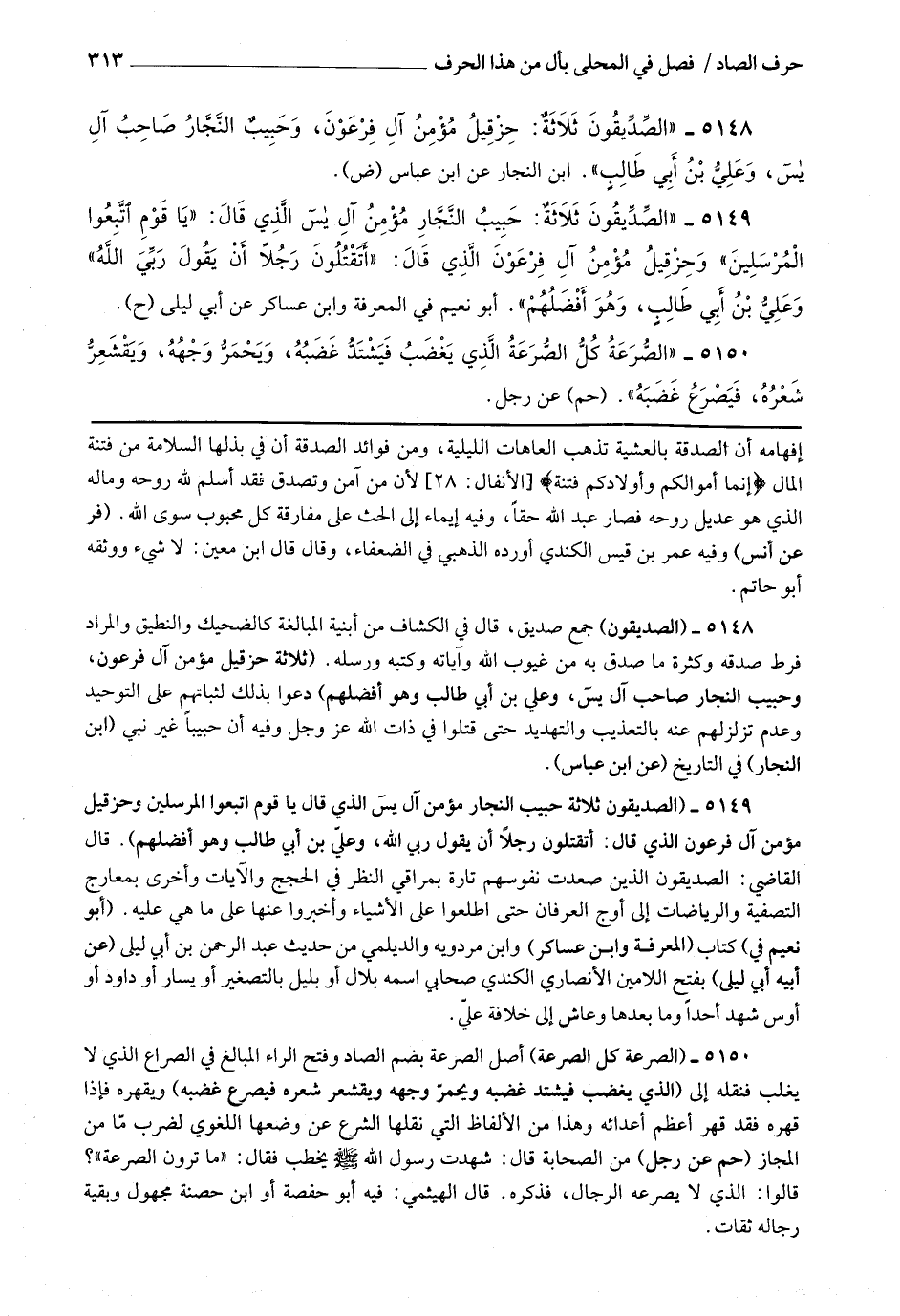 5149 - (الصديقون ثلاثة حبيب النجار مؤمن آل يس الذي قال يا قوم اتبعوا المرسلين وحزقيل مؤمن آل فرعون الذي قال أتقتلون رجلا أن يقول ربي الله وعلي بن أبي طالب وهو أفضلهم) قال القاضي : الصديقون الذين صعدت نفوسهم تارة بمراقي النظر في الحجج والآيات وأخرى بمعارج التصفية والرياضات إلى أوج العرفان حتى اطلعوا على الأشياء وأخبروا عنها على ما هي عليه.