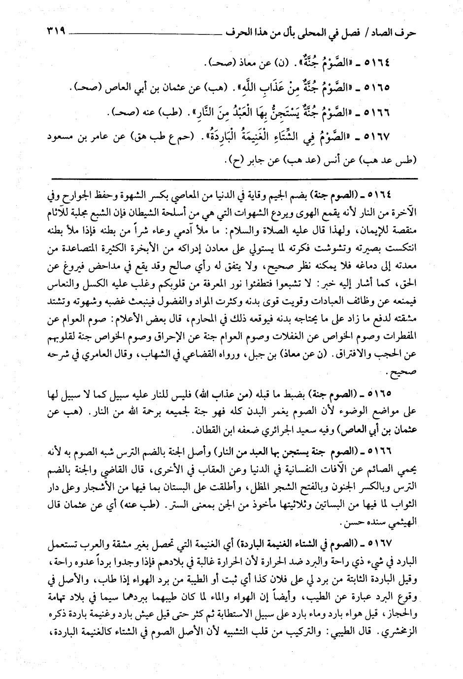 5165 - (الصوم جنة) بضبط ما قبله (من عذاب الله) فليس للنار عليه سبيل كما لا سبيل لها على مواضع الوضوء لأن الصوم يغمر البدن كله فهو جنة لجميعه برحمة الله من النار.
