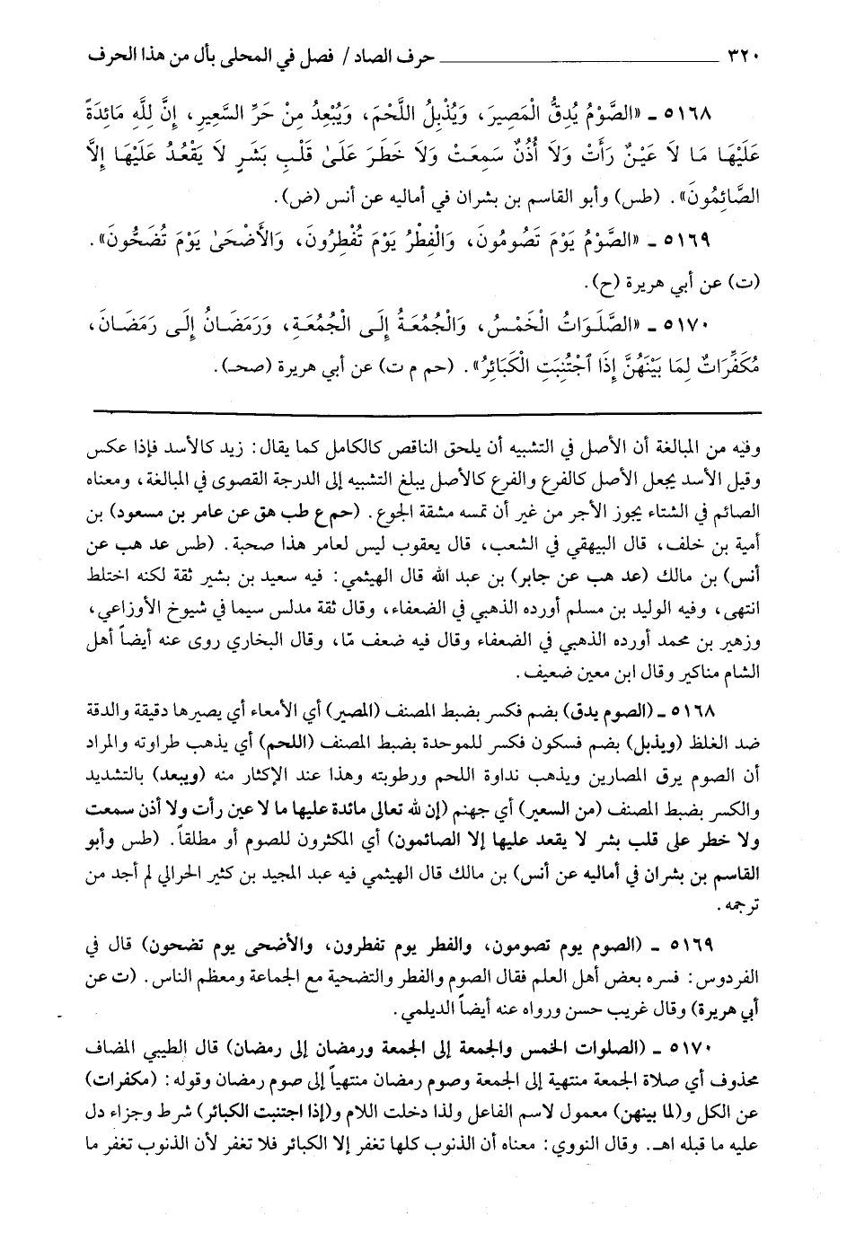 5169 - (الصوم يوم تصومون والفطر يوم تفطرون والأضحى يوم تضحون) قال في الفردوس : فسره بعض أهل العلم فقال : الصوم والفطر والتضحية مع الجماعة ومعظم الناس.