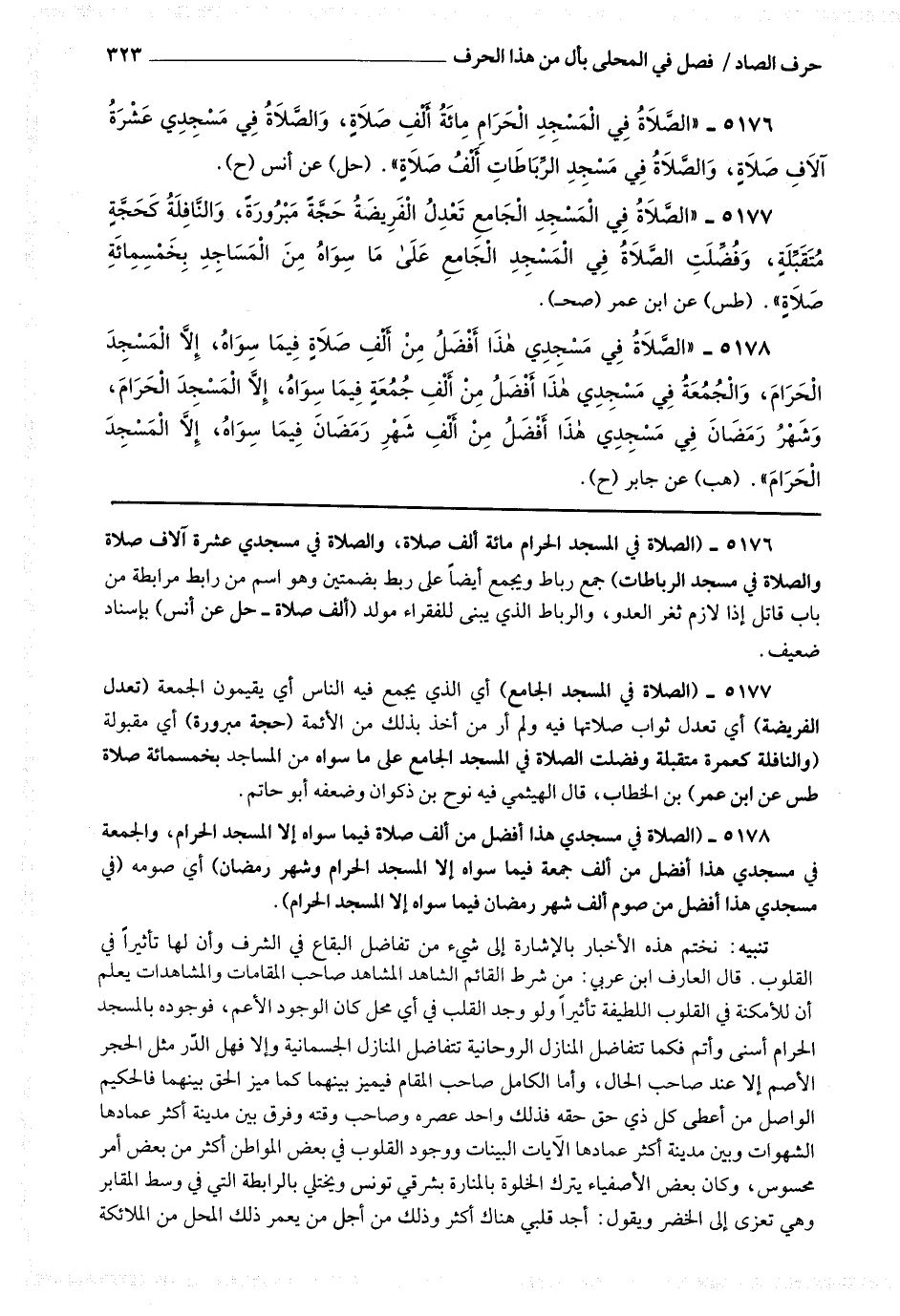 5176 - (الصلاة في المسجد الحرام مائة ألف صلاة والصلاة في مسجدي عشرة آلاف صلاة والصلاة في مسجد الرباطات) جمع رباط ويجمع أيضا على ربط بضمتين وهو اسم من رابط مرابطة من باب قاتل إذا لازم ثغر العدو والرباط الذي بيني للفقراء مولد (ألف صلاة).