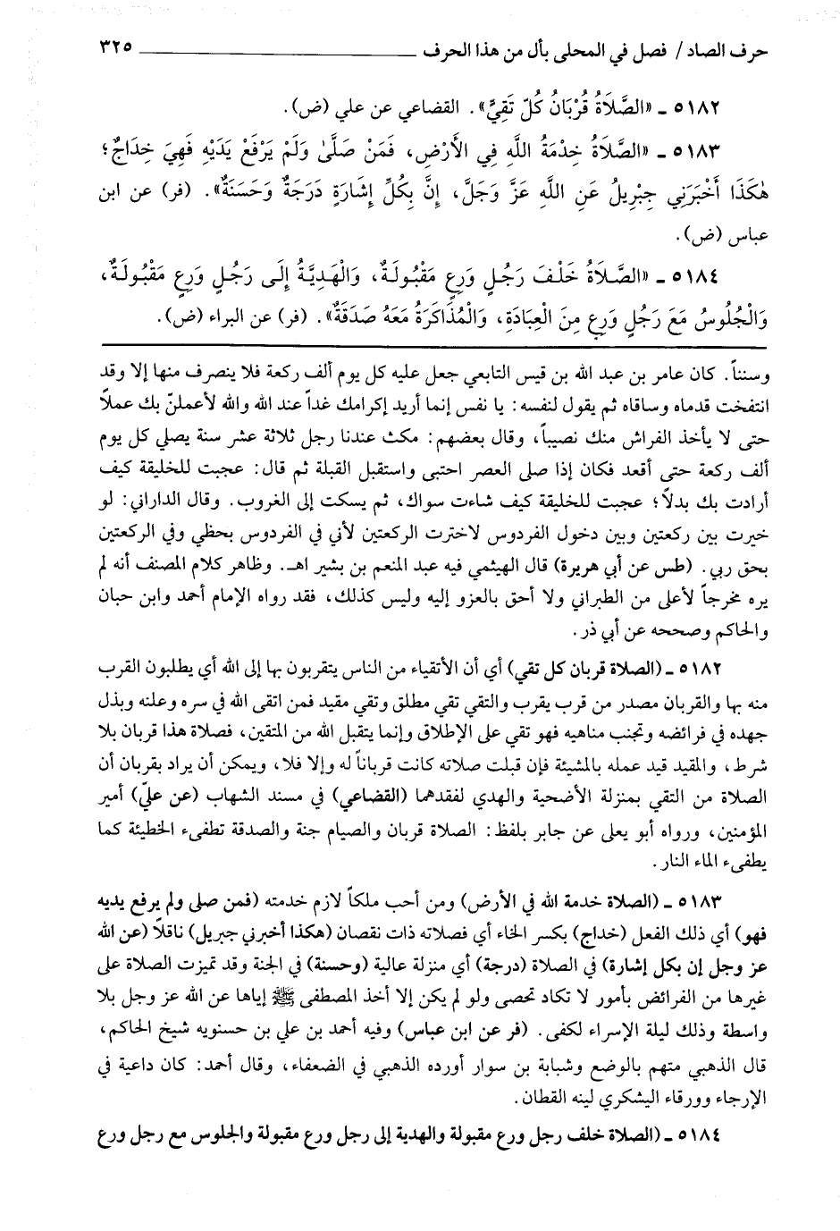 5182 - (الصلاة قربان كل تقي) أي أن الأتقياء من الناس يتقربون بها إلى الله أي يطلبون القرب منه بها والقربان مصدر من قرب يقرب والتقي تقي مطلق وتقي مقيد فمن اتقى الله في سره وعلنه وبذل جهده في فرائضه وتجنب مناهيه فهو تقي على الإطلاق وإنما يتقبل الله من المتقين ، فصلاة هذا قربان بلا شرط والمقيد قيد عمله بالمشيئة فإن قبلت صلاته كانت قربانا له وإلا فلا ويمكن أن يراد بقربان أن الصلاة من التقي بمنزلة الأضحية والهدى لفقدهما.