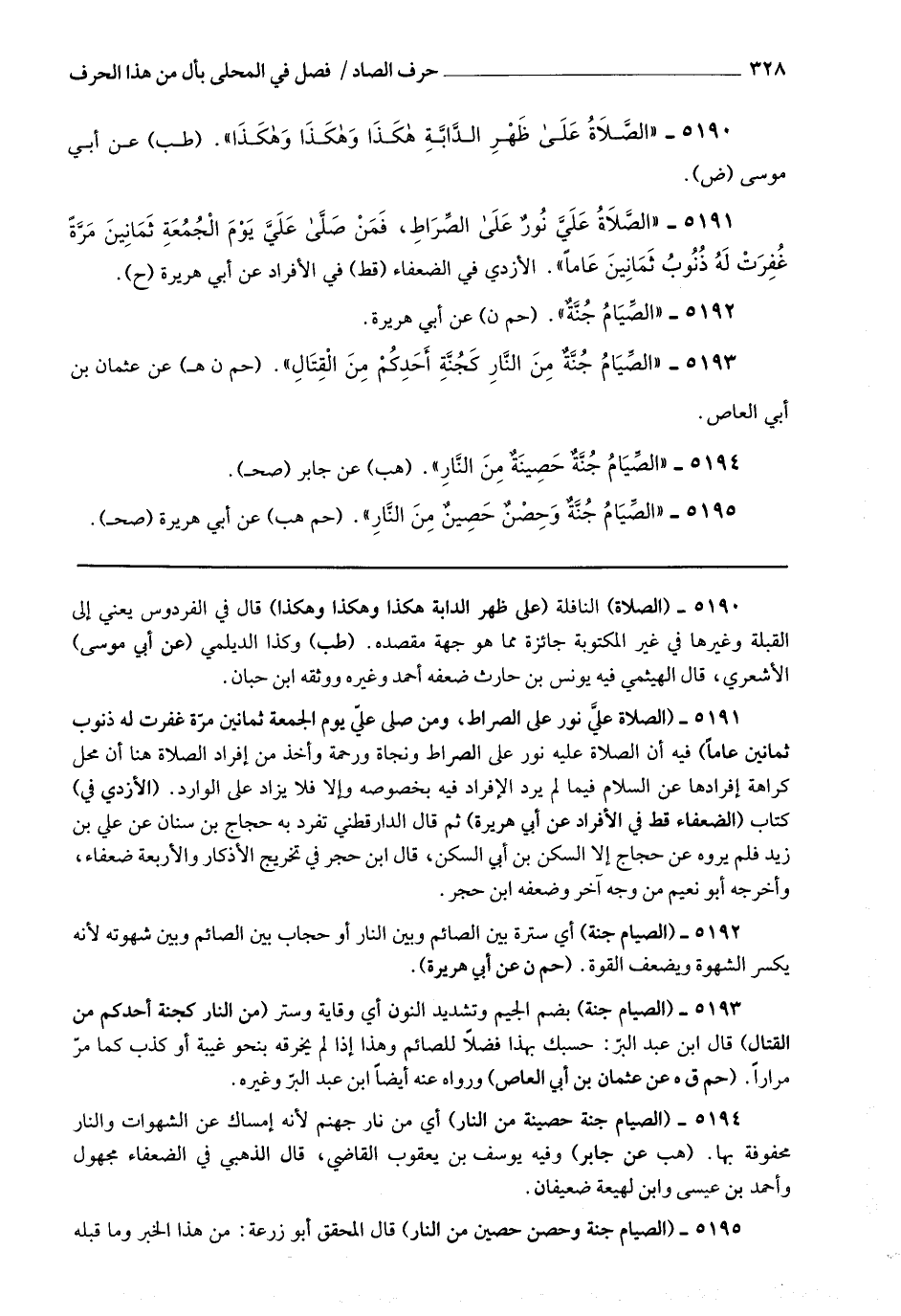 5191 - (الصلاة علي نور على الصراط ومن صلى علي يوم الجمعة ثمانين مرة غفرت له ذنوب ثمانين عاما) فيه أن الصلاة عليه نور على الصراط ونجاة ورحمة وأخذ من إفراد الصلاة هنا أن محل كراهة إفرادها عن السلام فيما لم يرد الإفراد فيه بخصوصه وإلا فلا يزاد على الوارد.