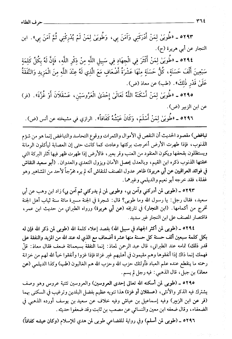 5296 - (طوبى لمن أسلم) وفي رواية للقضاعي طوبى لمن هدي للإسلام (وكان عيشه كفافا)