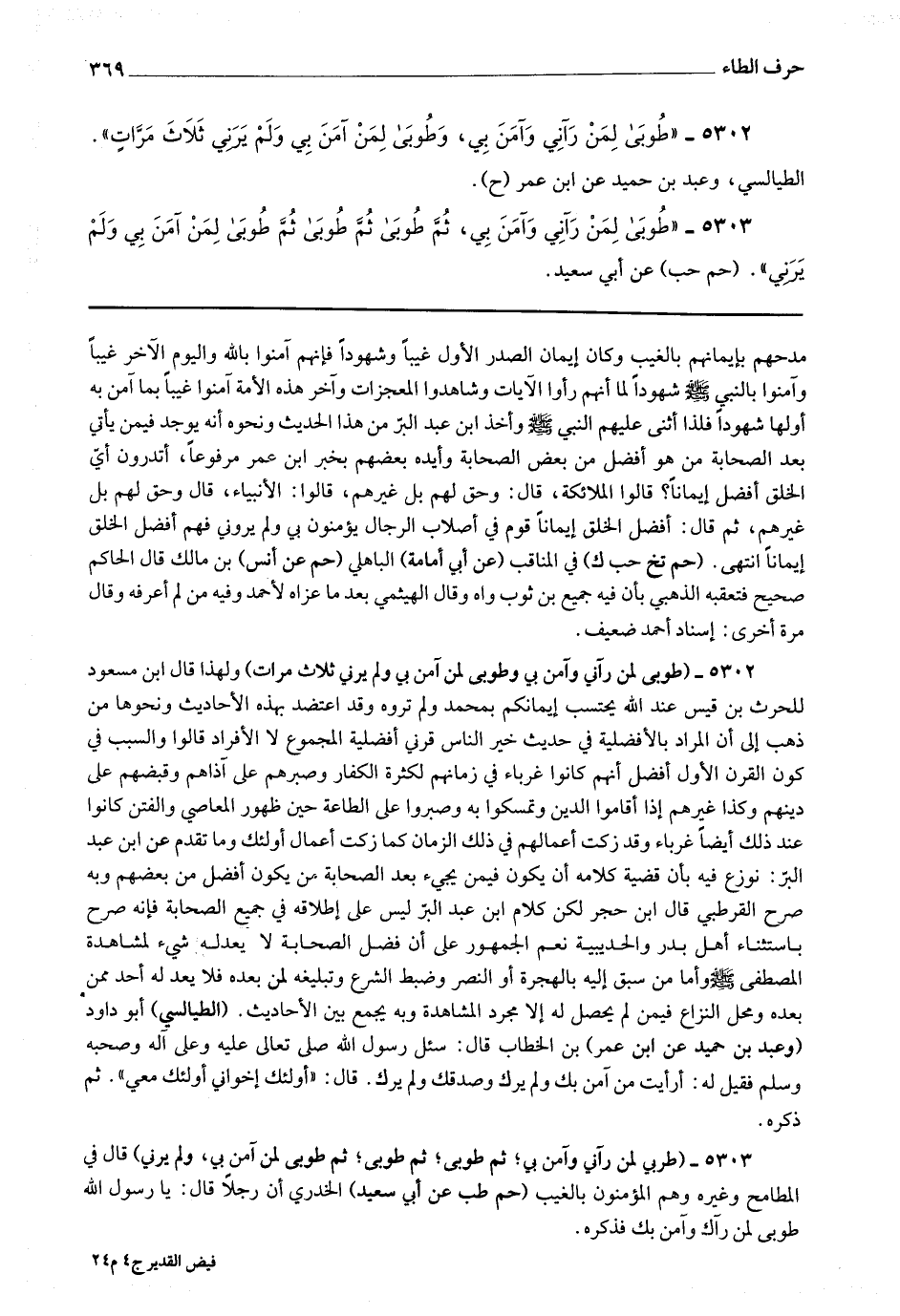 5303 - (طوبى لمن رآني وآمن بي ، ثم طوبى ، ثم طوبى ، ثم طوبى لمن آمن بي ، ولم يرني) قال في المطامح وغيره : وهم المؤمنون بالغيب.