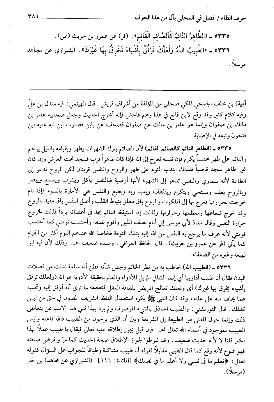 5335 - (الطاهر النائم كالصائم القائم) لأن الصائم بترك الشهوات يطهر وبقيامه بالليل يرحم والنائم على طهر محتسبا يكرم فإن نفسه تعرج إلى الله فإذا كان طاهرا قرب فسجد تحت العرش وإن كان غير طاهر سجد قاصيا فلذلك يندب النوم على طهر والروح والنفس قرينان لكن الروح تدعو إلى الطاعة لأنه سماوي والنفس تدعو إلى الشهوة لأنها أرضية فبالنفس يأكل ويشرب ويسمع ويبصر وبالروح يعف ويستحي ويتكرم ويتلطف ويعبد ربه ويطيع والنفس هي الأمارة بالسوء فإذا نام خرجت بحرارتها فعرج بها إلى الملكوت والروح باق معلق بنياط القلب وأصل النفس باق مقيد بالروح وقد خرج شعاعها ومعظمها وحرارتها ولذلك إذا استيقظ النائم يجد في أعضائه بردا فذلك لخروج حرارة النفس وقال معاذ لأبي موسى : إني أنام نصف الليل وأقوم نصفه وأحتسب نومتي كما أحتسب قومتي لأنه عرف ما يرجع به النفس من الله إليه بتلك النومة فخاصة الله عندهم النوم أكثر من القيام كما يأتي.