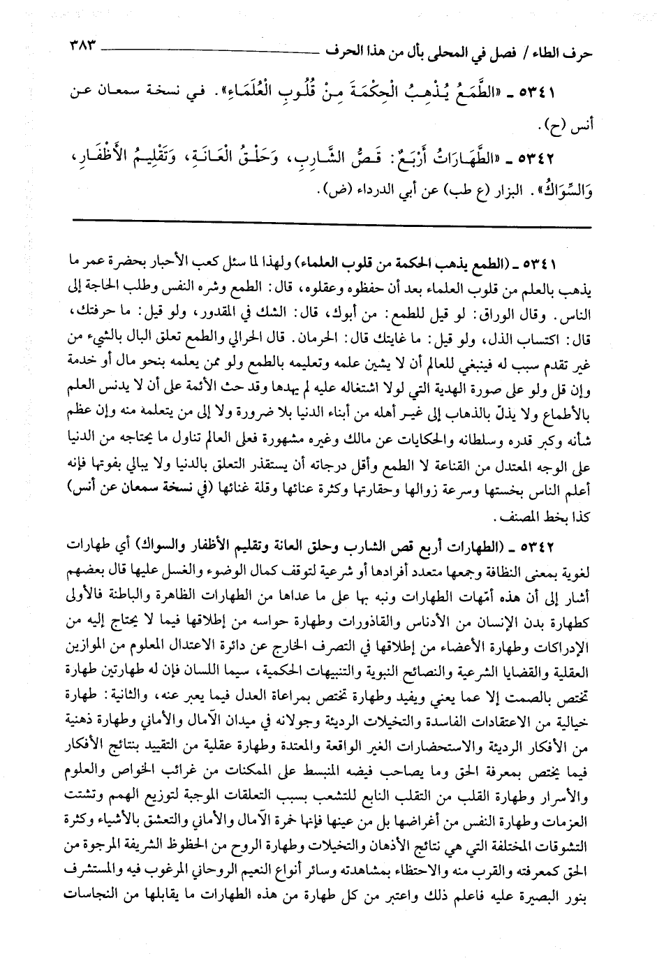 5342 - (الطهارات أربع قص الشارب وحلق العانة وتقليم الأظافر والسواك) أي طهارات لغوية بمعنى النظافة وجمعها بتعدد أفرادها أو شرعية لتوقف كمال الوضوء والغسل عليها قال بعضهم : أشار إلى أن هذه أمهات الطهارات ونبه بها على ما عداها من الطهارات الظاهرة والباطنة فالأولى
