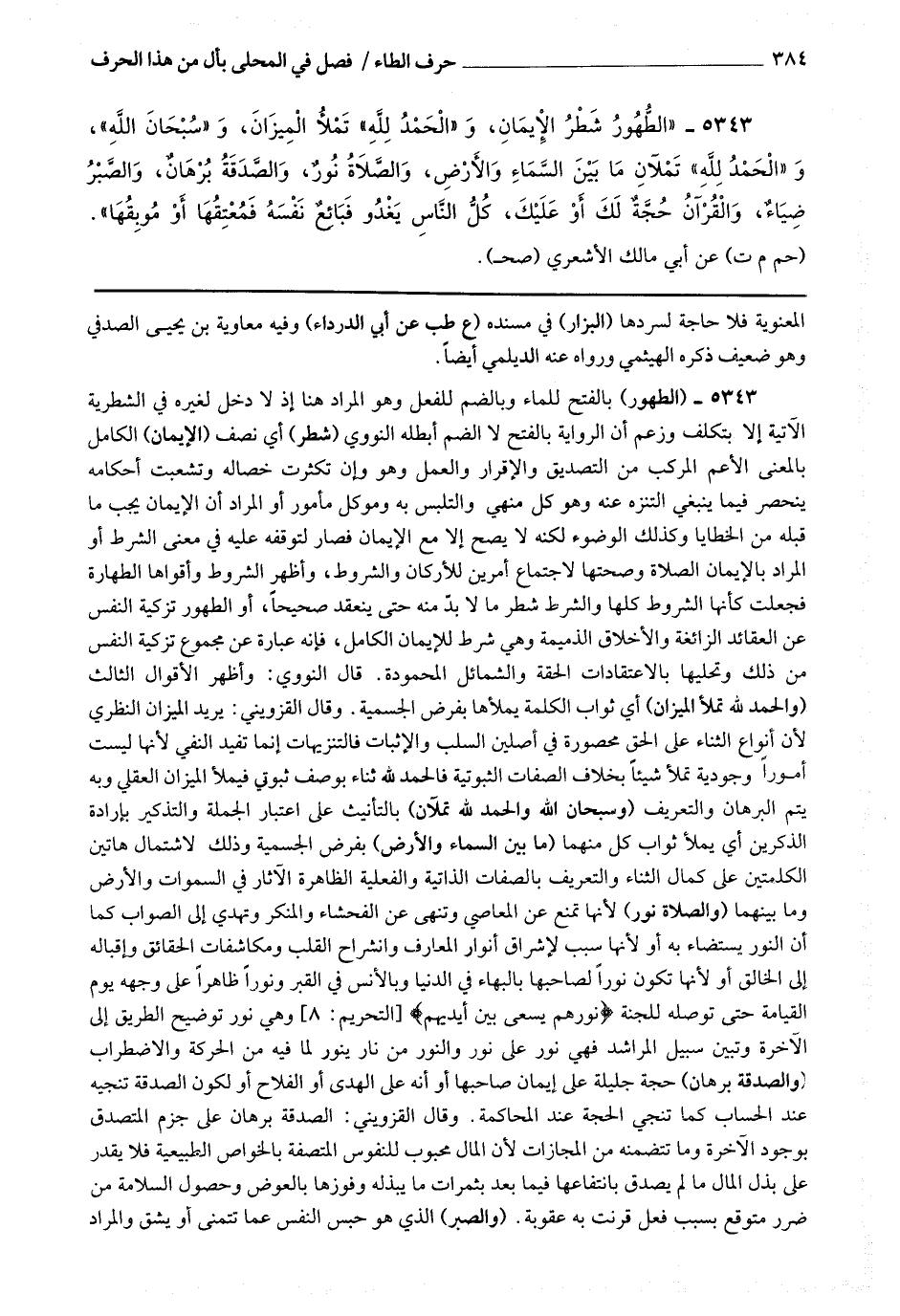 5343 - (الطهور) بالفتح للماء وبالضم للفعل وهو المراد هنا إذ لا دخل لغيره في الشطرية الآتية إلا بتكلف وزعم أن الرواية بالفتح لا الضم أبطله النووي (شطر) أي نصف (الإيمان) الكامل بالمعنى الأعم المركب من التصديق والإقرار والعمل وهو وإن تكثرت خصاله وتشعبت أحكامه ينحصر فيما ينبغي التنزه عنه وهو كل منهي والتلبس به وهو كل مأمور أو المراد أن الإيمان يجب ما قبله من الخطايا وكذلك الوضوء لكنه لا يصح إلا مع الإيمان فصار لتوقفه عليه في معنى الشرط أو المراد بالإيمان الصلاة وصحتها لاجتماع أمرين للأركان والشروط وأظهر الشروط وأقواها الطهارة فجعلت كأنها الشروط كلها والشرط ما لابد منه حتى ينعقد صحيحا أو الطهور تزكية النفس