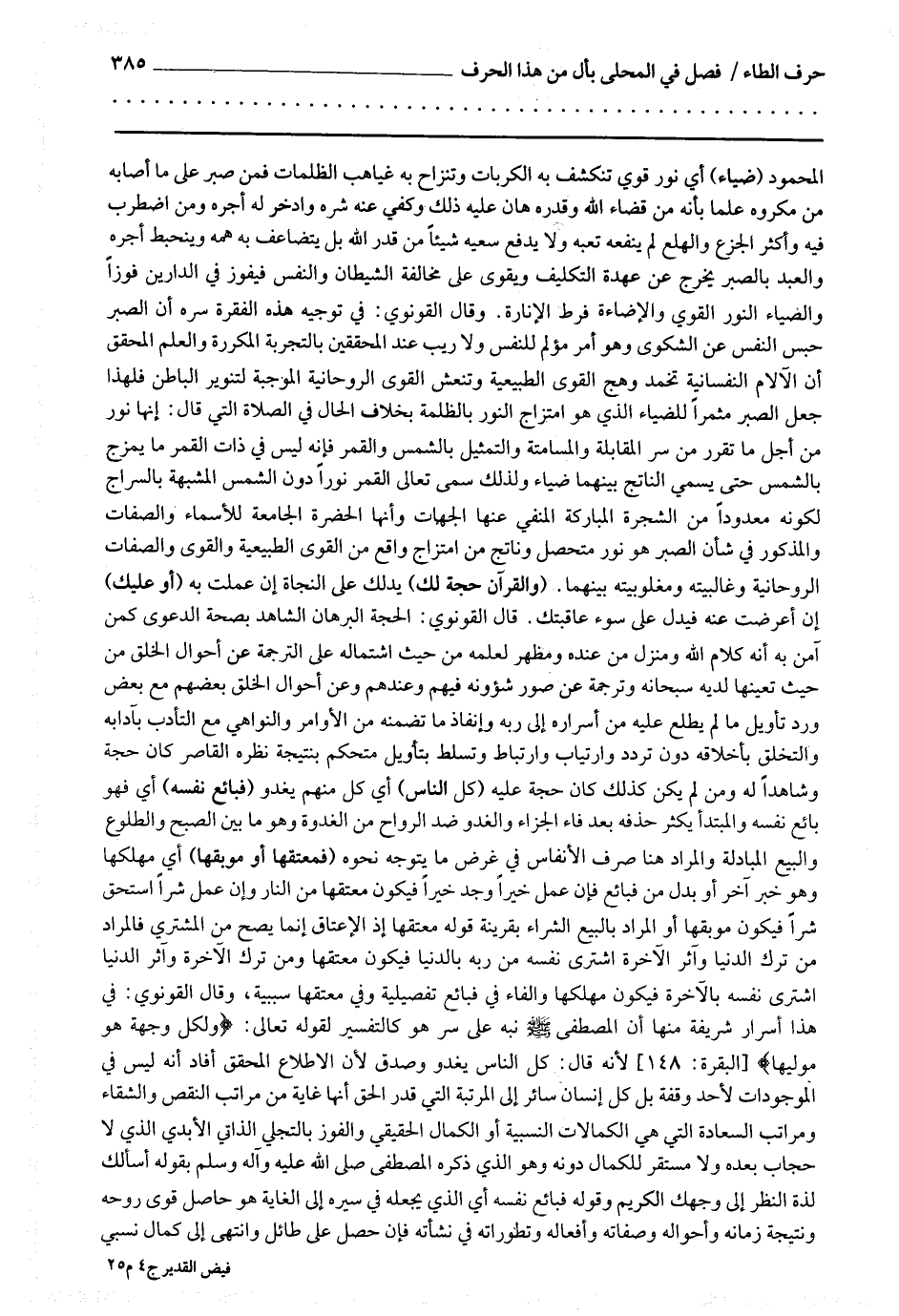 والعبد بالصبر يخرج عن عهدة التكليف ويقوى على مخالفة الشيطان والنفس فيفوز في الدارين فوزا والضياء النور القوي والإضاءة فرط الإنارة وقال القونوي في توجيه هذه الفقرة : سره أن الصبر حبس النفس عن الشكوى وهو أمر مؤلم للنفس ولا ريب عند المحققين بالتجربة المكررة والعلم المحقق أن الآلام النفسانية تخمد وهج القوى الطبيعية وتنعش القوى الروحانية الموجبة لتنوير الباطن فلهذا جعل الصبر مثمرا للضياء الذي هو امتزاج النور بالظلمة بخلاف الحال في الصلاة التي قال إنها نور من أجل ما تقرر من سر المقابلة والمسامتة والتمثيل بالشمس والقمر فإنه ليس في ذات القمر ما يمزج بالشمس حتى يسمى الناتج بينهما ضياء ولذلك سمى تعالى القمر نورا دون الشمس المشبهة بالسراج لكونه معدودا من الشجرة المباركة المنفي عنها الجهات وأنها الحضرة الجامعة للأسماء والصفات والمذكور في شأن الصبر هو نور متحصل وناتج من امتزاج واقع من القوى الطبيعية والقوى والصفات الروحانية وغالبيته ومغلوبيته بينهما (والقرآن حجة لك) يدلك على النجاة إن عملت به (أو عليك) إن أعرضت عنه فيدل على سوء عاقبتك قال القونوي : الحجة البرهان الشاهد بصحة الدعوى كمن آمن به أنه كلام الله ومنزل من عنده ومظهر لعلمه من حيث اشتماله على الترجمة عن أحوال الخلق من حيث تعينها لديه سبحانه وترجمة عن صور شؤونه فيهم وعندهم وعن أحوال الخلق بعضهم مع بعض ورد تأويل ما لم يطلع عليه من أسراره إلى ربه وإنفاذ ما تضمنه من الأوامر والنواهي مع التأدب بآدابه والتخلق بأخلاقه دون تردد وارتياب وارتباط وتسلط بتأويل متحكم بنتيجة نظره القاصر كان حجة وشاهدا له ومن لم يكن كذلك كان حجة عليه (كل الناس) أي كل منهم يغدو (فبائع نفسه) أي فهو بائع نفسه والمبتدأ يكثر حذفه بعد فاء الجزاء والغدو ضد الرواح من الغدوة وهو ما بين الصبح والطلوع والبيع المبادلة والمراد هنا صرف الأنفاس في غرض ما يتوجه نحوه (فمعتقها أو موبقها) أي مهلكها وهو خبر آخر أو بدل من فبائع فإن عمل خيرا وجد خيرا فيكون معتقها من النار وإن عمل شرا استحق شرا فيكون موبقها أو المراد بالبيع الشراء بقرينة قوله معتقها إذ الإعتاق إنما يصح من المشتري فالمراد من ترك الدنيا وآثر الآخرة اشترى نفسه من ربه بالدنيا فيكون معتقها ومن ترك الآخرة وآثر الدنيا