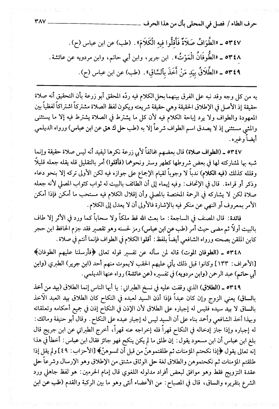 5347 - (الطواف صلاة) قال بعضهم مخالفا لأبي زرعة : نكرها ليفيد أنه ليس صلاة حقيقة وإنما شبه بها لمشاركته لها في بعض شروطها كطهر وستر ونحوهما (فأقلوا) أمر بالتقليل قله يقله جعله قليلا وقلله كذلك (فيه الكلام) ندبا لا وجوبا لقيام الإجماع على جوازه فيه لكن الأولى تركه إلا بنحو دعاء وذكر أو قراءة قال في الإتحاف : وفيه إيماء إلى أن الطائف بالبيت له ثواب كثواب المصلي لأنه جعله صلاة لكن لا يشاركه في الرحمة المختصة بالمصلي وأن إقلال الكلام فيه مستحب ما أمكن فإذا أمكن