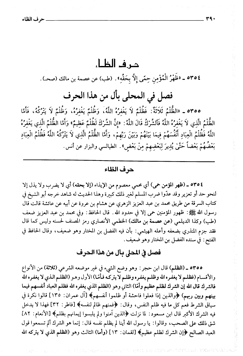 * 5355 - (الظلم) قال ابن حجر: وهو وضع الشئ في غير موضعه الشرعي (ثلاثة) من الأنواع والأقسام (فظلم لا يغفره الله وظلم يغفره وظلم لا يتركه فأما) الأول وهو (الظلم الذي لا يغفره الله فالشرك قال الله * (إن الشرك لظلم عظيم) * وأما) الثاني وهو (الظلم الذي يغفره الله فظلم العباد أنفسهم فيما بينهم وبين ربهم) * (والذين إذا فعلوا فاحشة أو ظلموا أنفسهم) * قالوا: نكرة في سياق الشرط فعم كل ما فيه ظلم النفس وقال * (فمنهم ظالم لنفسه) * فهذا لا يدخل فيه الشرك الأكبر قال ابن مسعود: لما نزلت * (الذين آمنوا ولم يلبسوا إيمانهم بظلم) * شق ذلك على الصحب وقالوا: يا رسول الله أينا لم يظلم نفسه قال: إنما هو الشرك ألم تسمعوا قول العبد الصالح * (إن الشرك لظلم عظيم) * (وأما) الثالث وهو (الظلم الذي لا يتركه الله