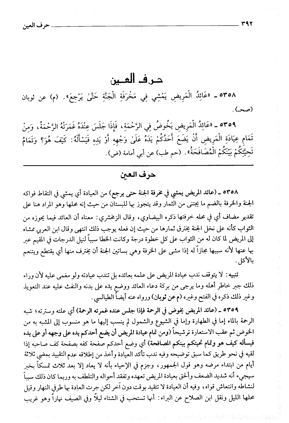 5359 - (عائد المريض يخوض في الرحمة فإذا جلس عنده غمرته الرحمة) أي علته وسترته، شبه الرحمة بالماء إما في الطهارة وإما في الشيوع والشمول لم ينسب إليها ما هو منسوب إلى المشبه به من الخوض ثم عقب الاستعارة ترشيحا (ومن تمام عيادة المريض أن يضع أحدكم يده على وجهه فيسأله كيف هو وتمام تحيتكم بينكم المصافحة) أي وضع أحدكم صفحة كفه بصفحة كف صاحبه إذا لقيه في نحو طريق كما سبق توضيحه وفيه ندب تأكد العيادة وأخذ من إطلاقه عدم التقييد بمضي ثلاثة أيام من ابتداء مرضه وهو قول الجمهور، وجزم في الإحياء بأنه لا يعاد إلا بعد ثلاث تمسكا بخبر سيجئ أنه شديد الضعف وألحق بعيادة المريض تعهده وتفقد أحواله والتلطف به وربما كان ذلك سببا لنشاطه وانتعاش قواه، وفيه أن العيادة لا تتقيد بوقت دون آخر لكن جرت العادة بها طرفي النهار وقيل محلها الليل ونقل ابن الصلاح عن البراء أنها تستحب في الشتاء ليلا وفي الصيف نهارا وهو غريب