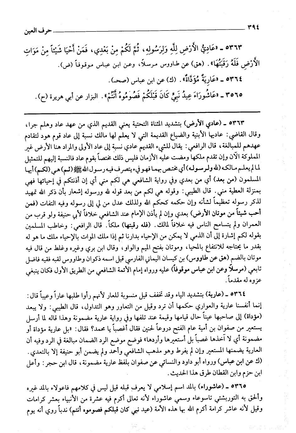 5363 - (عادى الأرض) بتشديد المثناة التحتية يعني القديم الذي من عهد عاد وهلم جرا ، وقال القاضي : عاديها الأبنية والضياع القديمة التي لا يعلم لها مالك نسبة إلى عاد قوم هود لتقادم عهدهم للمبالغة قال الرافعي : يقال للشئ القديم عادى نسبة إلى عاد الأولى والمراد هنا الأرض غير المملوكة الآن وإن تقدم ملكها ومضت عليه الأزمان فليس ذلك مختصا بقوم عاد فالنسبة إليهم للتمثيل لما لم يعلم مالكه (لله ورسوله) أي مختص بهما فهو فئ يتصرف فيه رسول الله صلى الله عليه وسلم (ثم) هي (لكم) أيها المسلمون (من بعد) أي من بعدي وفي رواية الشافعي هي لكم مني أي إن أذنتكم في إحيائها فهي بمنزلة العطية مني قال الطيبي : وقوله هي لكم من بعد قوله لله ورسوله إشعار بأن ذكر الله تمهيد لذكر رسوله تعظيما لشأنه وإن حكمه كحكم الله ولذلك عدل من لي إلى رسوله وفيه التفات (فمن أحب شيئا من موتان الأرض) بعدي وإن لم يأذن الإمام عند الشافعي خلافا لأبي حنيفة ولو قرب من العمران ولم يتسامح الناس فيه خلافا لمالك (فله رقبتها) ملكا قال الرافعي : وخاطب المسلمين بقوله لكم إشارة أن الذمي لا يمكن من الإحياء بدارنا ثم إذا ملك الموات بالإحياء ملك ما هو له بقدر ما يحتاجه للانتفاع بالمحيا ، وموتان بفتح الميم والواو ، وقال ابن بري وغيره : وغلط من قال فيه موتان بالضم.