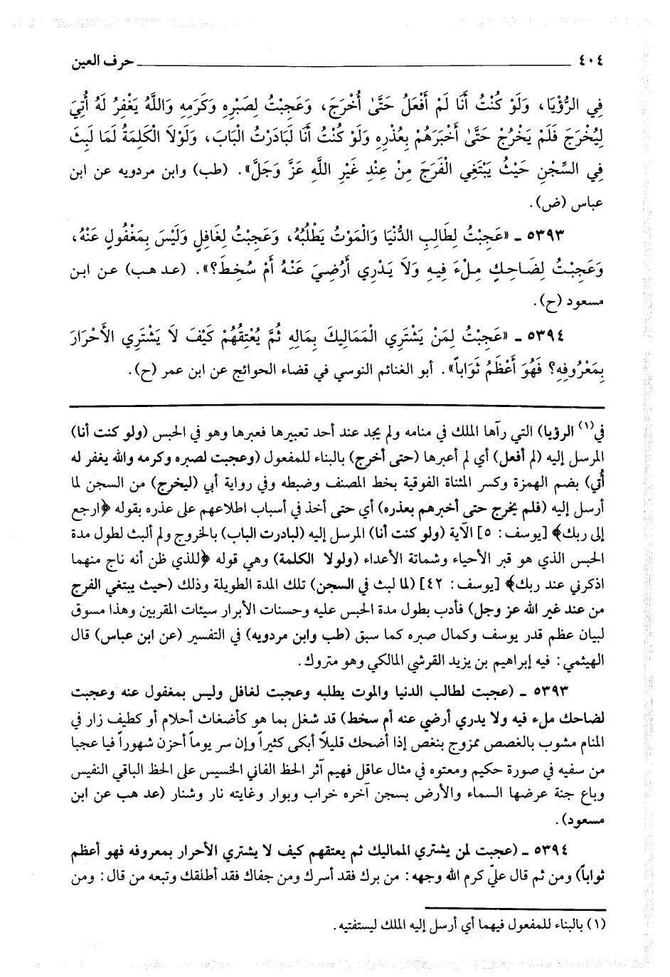 5393 - (عجبت لطالب الدنيا والموت يطلبه وعجبت لغافل وليس بمغفول عنه وعجبت لضاحك ملء فيه ولا يدري أرضي عنه أم سخط) قد شغل بما هو كأضغاث أحلام أو كطيف زار في المنام مشوب بالغصص ممزوج بنغص إذا أضحك قليلا أبكى كثيرا وإن سر يوما أحزن شهورا فيا عجبا من سفيه في صورة حكيم ومعتوه في مثال عاقل فهيم آثر الحظ الفاني الخسيس على الحظ الباقي النفيس وباع جنة عرضها السماء والأرض بسجن آخره خراب وبوار وغايته نار وشنار.