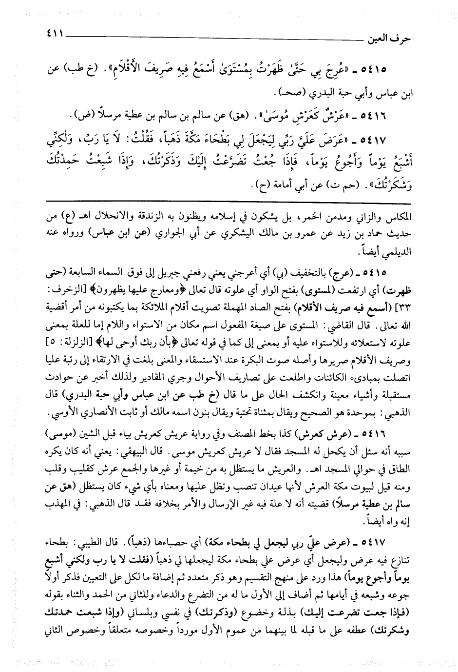 5415 - (عرج) بالتخفيف (بي) أي أعرجني يعني رفعني جبريل إلى فوق السماء السابعة (حتى ظهرت) أي ارتفعت (لمستوى) بفتح الواو أي علوته قال تعالى * (ومعارج عليها يظهرون) * (أسمع فيه صريف الأقلام) بفتح الصاد المهملة تصويت أقلام الملائكة بما يكتبونه من أمر أقضية الله تعالى قال القاضي : المستوى على صيغة المفعول اسم مكان من الاستواء واللام إما للعلة بمعنى علوته لاستعلائه وللاستواء عليه أو بمعنى إلى كما في قوله تعالى * (بأن ربك أوحى لها) * وصريف الأقلام صريرها وأصله صوت البكرة عند الاستسقاء والمعنى بلغت في الارتقاء إلى رتبة عليا اتصلت بمبادئ الكائنات واطلعت على تصاريف الأحوال وجري المقادير ولذلك أخبر عن حوادث