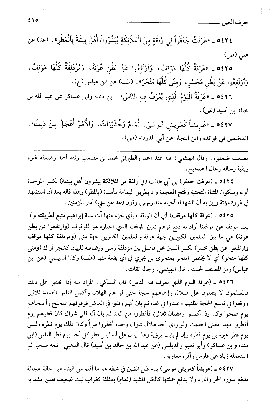 5425 - (عرفة كلها موقف) أي أن الواقف بأي جزء منها آت سنة إبراهيم متبع لطريقته وأن بعد موقفه عن موقفنا أراد به دفع توهم تعين الموقف الذي اختاره هو للوقوف (وارتفعوا عن بطن عرنة) هي ما بين العلمين الكبيرين جهة عرفة والعلمين الكبيرين جهة منى (ومزدلفة كلها موقف وارتفعوا عن بطن محسر) بكسر السين محل فاصل بين مزدلفة ومنى وإضافته للبيان كشجر أراك (ومنى كلها منحر) أي لا يختص المنحر بمنحري بل يجزئ في أي بقعة منها.