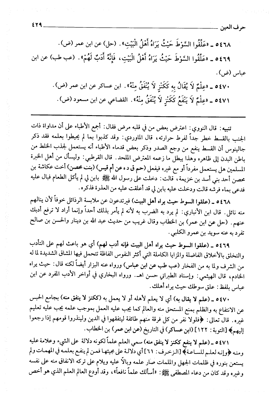 5471 - (علم لا ينفع ككنز لا ينفق منه) سمي العلم علما لكونه دلالة على الشئ وعلامة عليه ومنه * (وإنه لعلم للساعة) * أي دلالة على مجيئها فمن لم ينفع بعلمه في المهمات ولم يستعن بنوره في ظلمات الجهل والملمات صار علمه وبالا عليه ويلام على تركه الإنفاق منه على نفسه وغيره وقد كان من دعاء المصطفى صلى الله عليه وسلم أسألك علما نافعا وقد أودع العالم العلم الذي هو أخص