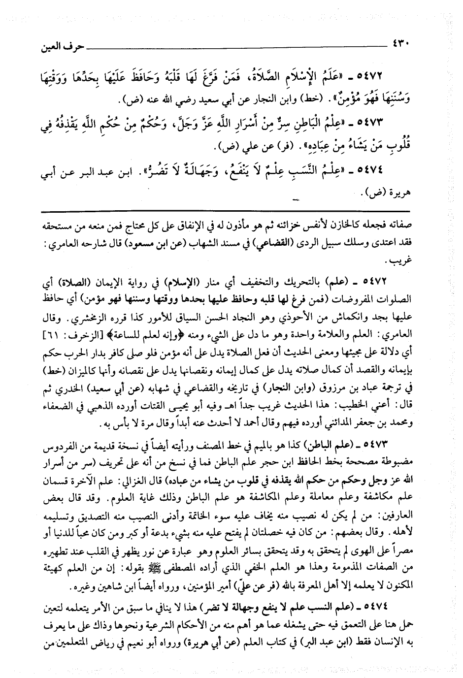 5473 - (علم الباطن) كذا هو بالميم في خط المصنف ورأيته أيضا في نسخة قديمة من الفردوس مضبوطة مصححة بخط الحافظ ابن حجر علم الباطن فما في نسخ من أنه على تحريف (سر من أسرار الله عز وجل وحكم من حكم الله يقذفه في قلوب من يشاء من عباده) قال الغزالي : علم الآخرة قسمان علم مكاشفة وعلم معاملة وعلم المكاشفة هو علم الباطن وذلك غاية العلوم وقد قال بعض العارفين : من لم يكن له نصيب منه يخاف عليه سوء الخاتمة وأدنى النصيب منه التصديق وتسليمه لأهله وقال بعضهم : من كان فيه خصلتان لم يفتح عليه منه بشئ بدعة أو كبر ومن كان محبا للدنيا أو مصرا على الهوى لم يتحقق به وقد يتحقق بسائر العلوم وهو عبارة عن نور يظهر في القلب عند تطهيره من الصفات المذمومة وهذا هو العلم الخفي الذي أراده المصطفى صلى الله عليه وسلم بقوله إن من العلم كهيئة المكنون لا يعلمه إلا أهل المعرفة بالله.