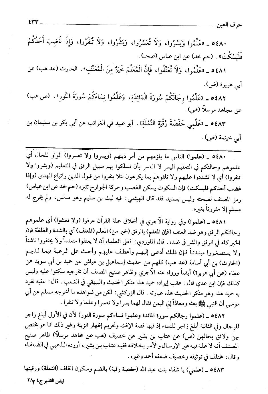 5482 - (علموا رجالكم سورة المائدة وعلموا نساءكم سورة النور) لأن في الأولى أبلغ زاجر للرجال وفي الثانية أبلغ زاجر للنساء إذ فيها قصة الإفك وتحريم إظهار الزينة وغير ذلك مما هو مختص بهن ولائق بحالهن.
