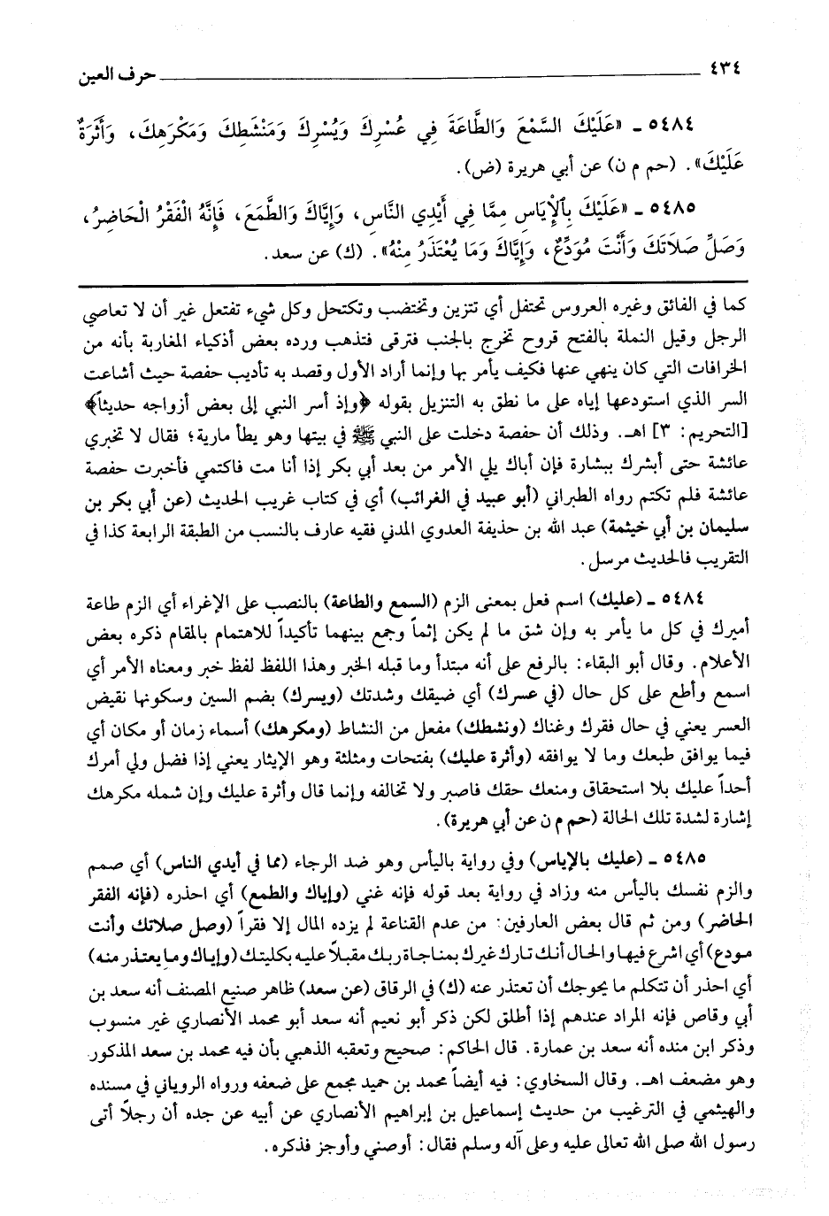 5484 - (عليك) اسم فعل بمعنى الزم (السمع والطاعة) بالنصب على الإغراء أي الزم طاعة أميرك في كل ما يأمر به وإن شق ما لم يكن إثما وجمع بينهما تأكيدا للاهتمام بالمقام ذكره بعض الأعلام وقال أبو البقاء : بالرفع على أنه مبتدأ وما قبله الخبر وهذا اللفظ لفظ خبر ومعناه الأمر أي اسمع وأطع على كل حال (في عسرك) أي ضيقك وشدتك (ويسرك) بضم السين وسكونها نقيض العسر يعني في حال فقرك وغناك (ونشطك) مفعل من النشاط (ومكرهك) أسماء زمان أو مكان أي فيما يوافق طبعك وما لا يوافقه (وأثرة عليك) بفتحات ومثلثة وهو الإيثار يعني إذا فضل ولي أمرك أحدا عليك بلا استحقاق ومنعك حقك فاصبر ولا تخالفه وإنما قال وأثرة عليك وإن شمله مكرهك إشارة لشدة تلك الحالة.