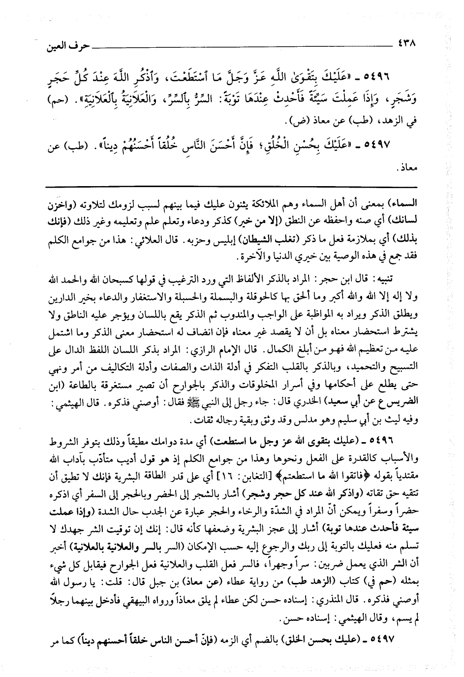 5496 - (عليك بتقوى الله عز وجل ما استطعت) أي مدة دوامك مطيقا وذلك بتوفر الشروط والأسباب كالقدرة على الفعل ونحوها وهذا من جوامع الكلم إذ هو قول أديب متأدب بآداب الله مقتديا بقوله * (فاتقوا الله ما استطعتم) * أي على قدر الطاقة البشرية فإنك لا تطيق أن تتقيه حق تقاته (واذكر الله عند كل حجر وشجر) أشار بالشجر إلى الحضر وبالحجر إلى السفر أي اذكره