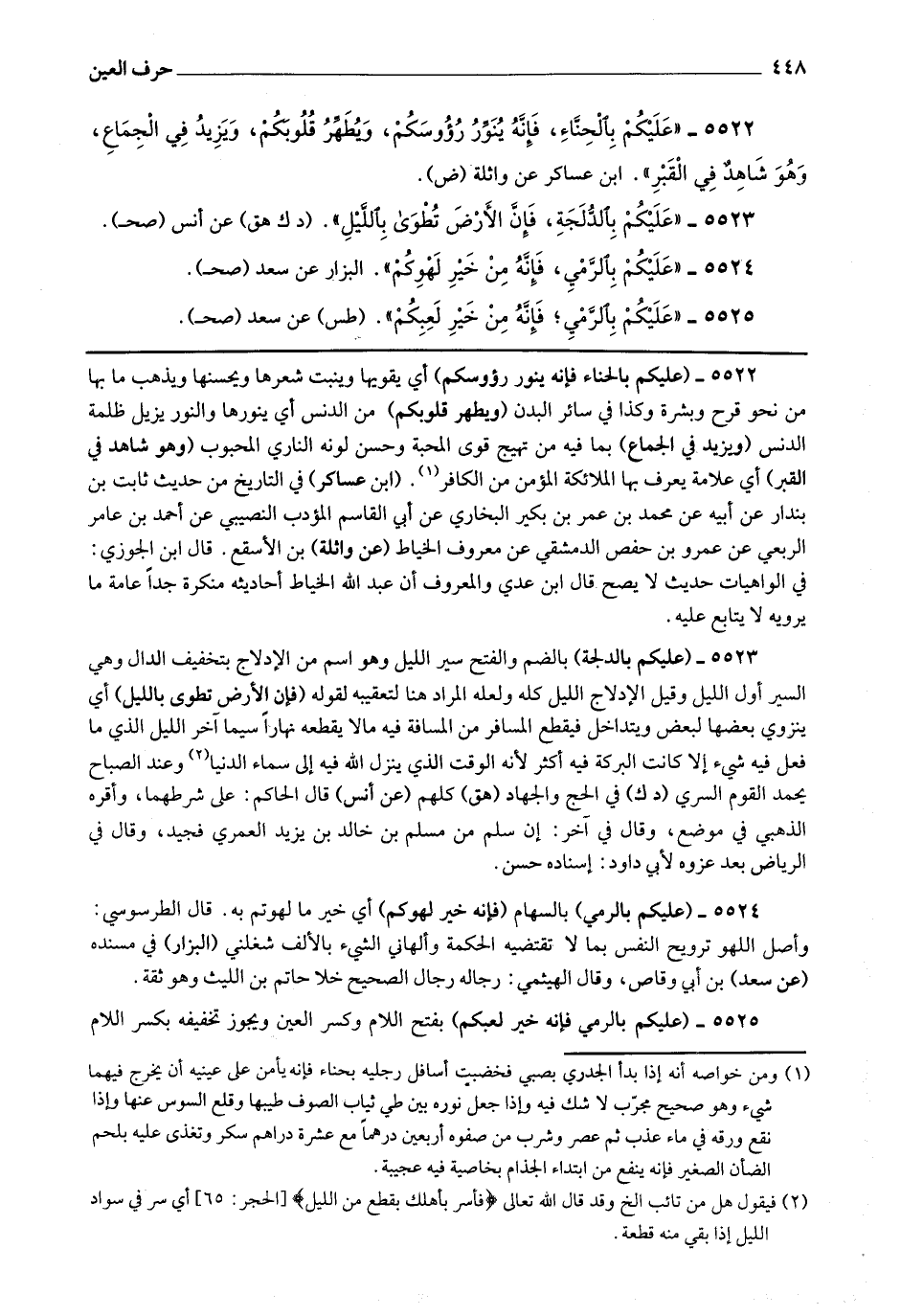 5523 - (عليكم بالدلجة) بالضم والفتح سير الليل وهو اسم من الإدلاج بتخفيف الدال وهي