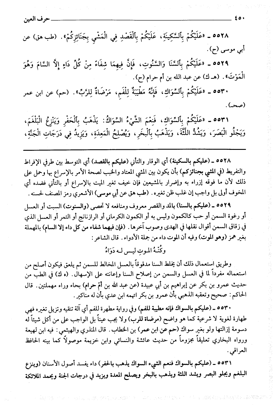 5531 - (عليكم بالسواك فنعم الشئ السواك يذهب بالحفر) داء يفسد أصول الأسنان (وينزع البلغم ويجلو البصر ويشد اللثة ويذهب بالبخر ويصلح المعدة ويزيد في درجات الجنة ويحمد الملائكة