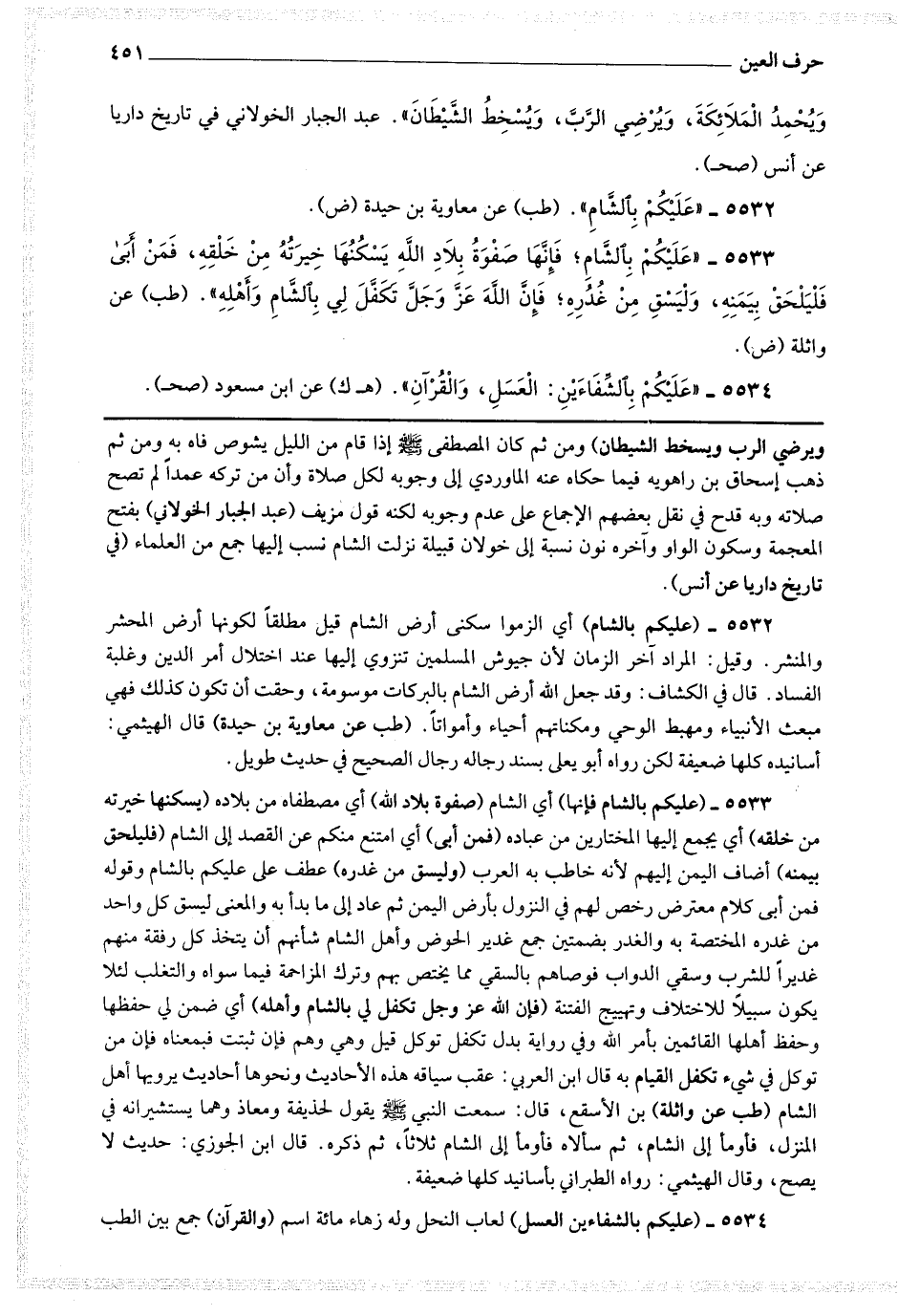 5532 - (عليكم بالشام) أي الزموا سكنى أرض الشام قيل مطلقا لكونها أرض المحشر والمنشر وقيل المراد آخر الزمان لأن جيوش المسلمين تنزوي إليها عند اختلال أمر الدين وغلبة الفساد.