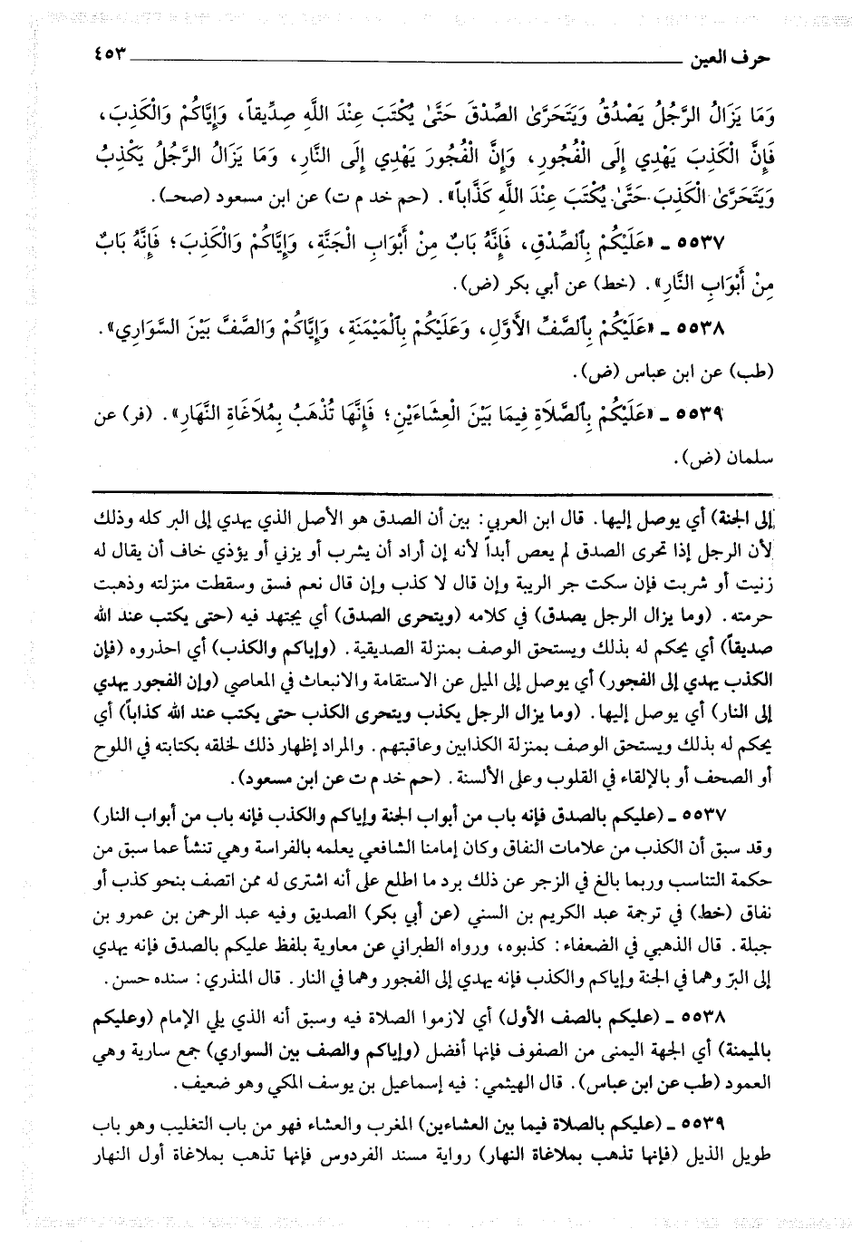 5537 - (عليكم بالصدق فإنه باب من أبواب الجنة وإياكم والكذب فإنه باب من أبواب النار) وقد سبق أن الكذب من علامات النفاق وكان إمامنا الشافعي يعلمه بالفراسة وهي تنشأ عما سبق من حكمة التناسب وربما بالغ في الزجر عن ذلك يرد ما اطلع على أنه اشترى له ممن اتصف بنحو كذب أو نفاق.