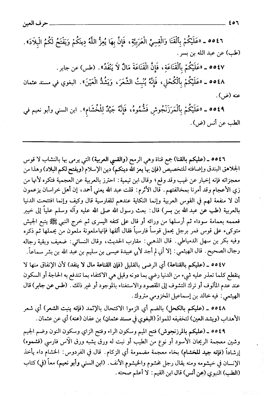 5546 - (عليكم بالقنا) جمع قناة وهي الرمح (والقسى العربية) التي يرمى بها بالنشاب لا قوس الجلاهق البندق وإضافته للتخصيص (فإن بها يعز الله دينكم) دين الإسلام (ويفتح لكم البلاد) وهذا من معجزاته فإنه إخبار عن غيب وقد وقع ، وقال ابن تيمية : احترز بالعربية عن العجمية فتكره لانها من زي الأعجام وقد أمرنا بمخالفتهم قال الأثرم : قلت عبد الله يعني أحمد إن أهل خراسان يزعمون ألا منفعة لهم في القوس العربية وإنما النكاية عندهم للفارسية قال : وكيف و إنما افتتحت الدنيا بالعربية.