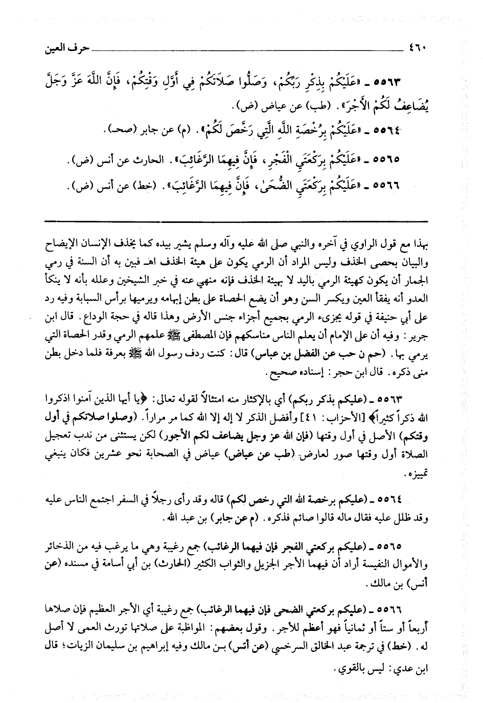 5566 - (عليكم بركعتي الضحى فإن فيهما الرغائب) جمع رغيبة أي الأجر العظيم فإن صلاها أربعا أو ستا أو ثمانيا فهو أعظم للأجر وقول بعضهم المواظبة على صلاتها تورث العمى لا أصل له.