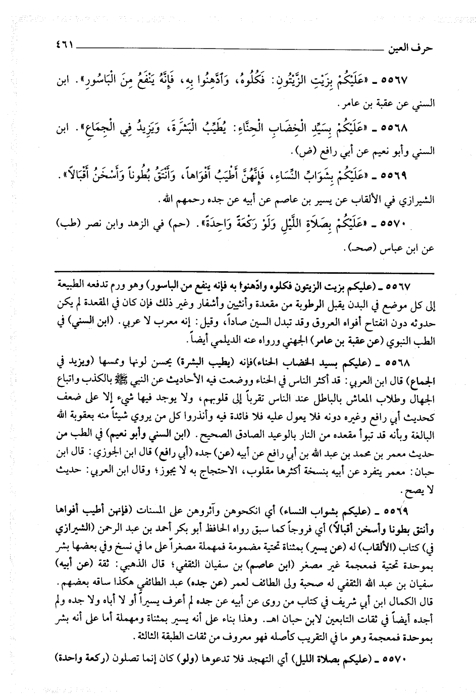 5568 - (عليكم بسيد الخضاب الحناء) فإنه (يطيب البشرة) يحسن لونها وممسها (ويزيد في الجماع) قال ابن العربي : قد أكثر الناس في الحناء ووضعت فيه الأحاديث عن النبي صلى الله عليه وسلم بالكذب واتباع الجهال وطلاب المعاش بالباطل عند الناس تقربا إلى قلوبهم ولا يوجد فيها شئ إلا عن ضعف كحديث أبي رافع وغيره دونه فلا يعول عليه فلا فائدة فيه وأنذروا كل من يروي شيئا منه بعقوبة الله البالغة وبأنه قد تبوأ مقعده من النار بالوعيد الصادق الصحيح.