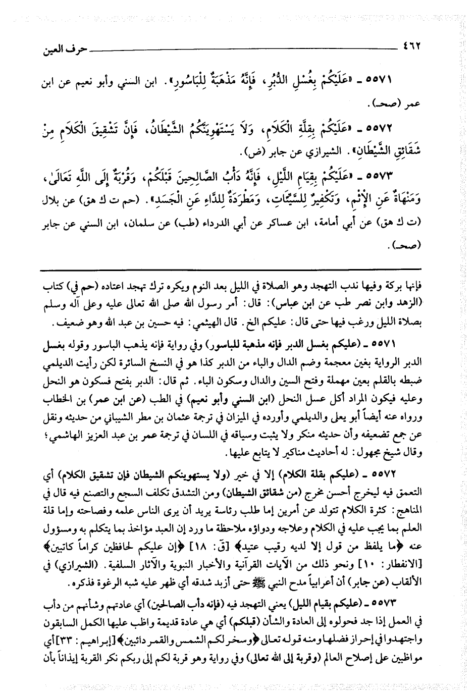 5571 - (عليكم بغسل الدبر فإنه مذهبة للباسور) وفي رواية فإنه يذهب الباسور وقوله بغسل الدبر الرواية بغين معجمة وضم الدال والباء من الدبر كذا هو في النسخ السائرة لكن رأيت الديلمي ضبطه بالقلم بعين مهملة وفتح السين والدال وسكون الباء ثم قال الدبر بفتح فسكون هو النحل وعليه فيكون المراد أكل عسل النحل.