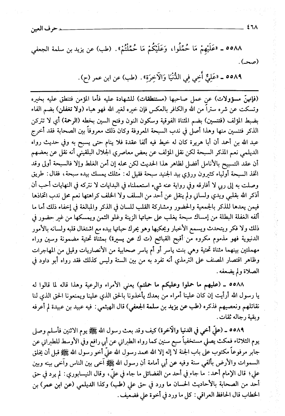 5589 - (علي أخي في الدنيا والآخرة) كيف وقد بعث رسول الله صلى الله عليه وسلم يوم الاثنين فأسلم وصلى يوم الثلاثاء فمكث يصلي مستخفيا سبع سنين كما رواه الطبراني عن أبي رافع وفي الأوسط للطبراني عن جابر مرفوعا مكتوب على باب الجنة لا إله إلا الله محمد رسول الله علي أخو رسول الله صلى الله عليه وسلم قبل أن يخلق السماوات والأرض بألفي سنة وفيه عن أبي أمامة أن رسول الله صلى الله عليه وسلم آخى بين الناس وآخى بينه وبين علي قال الإمام أحمد : ما جاء في أحد من الفضائل ما جاء في علي وقال النيسابوري : لم يرد في حق أحد من الصحابة بالأحاديث الحسان ما ورد في حق علي.