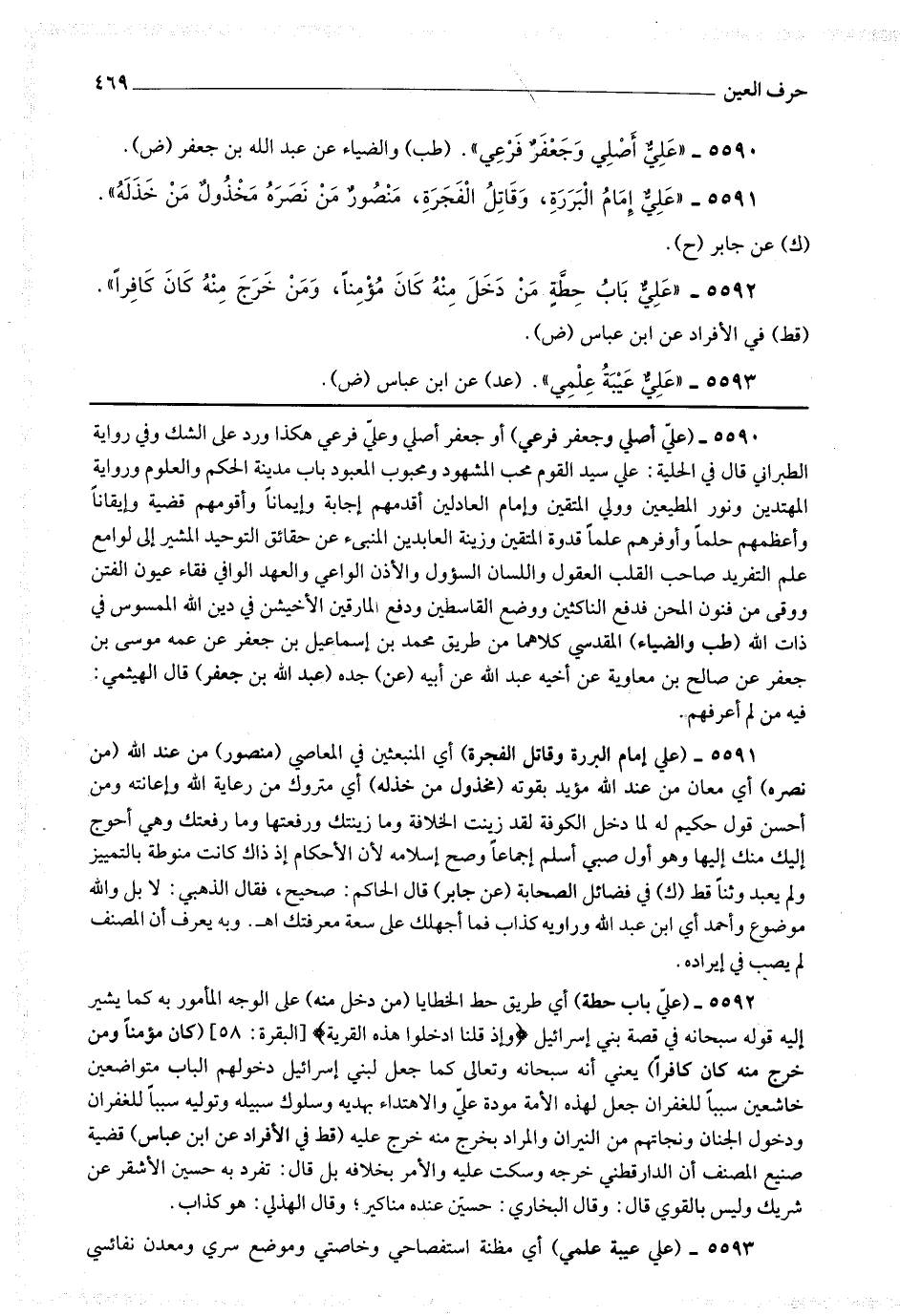 5590 - (علي أصلي وجعفر فرعي) أو جعفر أصلي وعلي فرعي هكذا ورد على الشك وفي رواية الطبراني قال في الحلية : علي سيد القوم محب المشهود ومحبوب المعبود باب مدينة الحكم والعلوم ورواية المهتدين ونور المطيعين وولي المتقين وإمام العادلين أقدمهم إجابة وإيمانا وأقومهم قضية وإيقانا وأعظمهم حلما وأوفرهم علما قدوة المتقين وزينة العابدين المنبئ عن حقائق التوحيد المشير إلى لوامع علم التفريد صاحب القلب العقول واللسان السؤول والأذن الواعي والعهد الوافي فقاء عيون الفتن ووقى من فنون المحن فدفع الناكثين ووضع القاسطين ودفع المارقين الأخيشن في دين الله الممسوس في