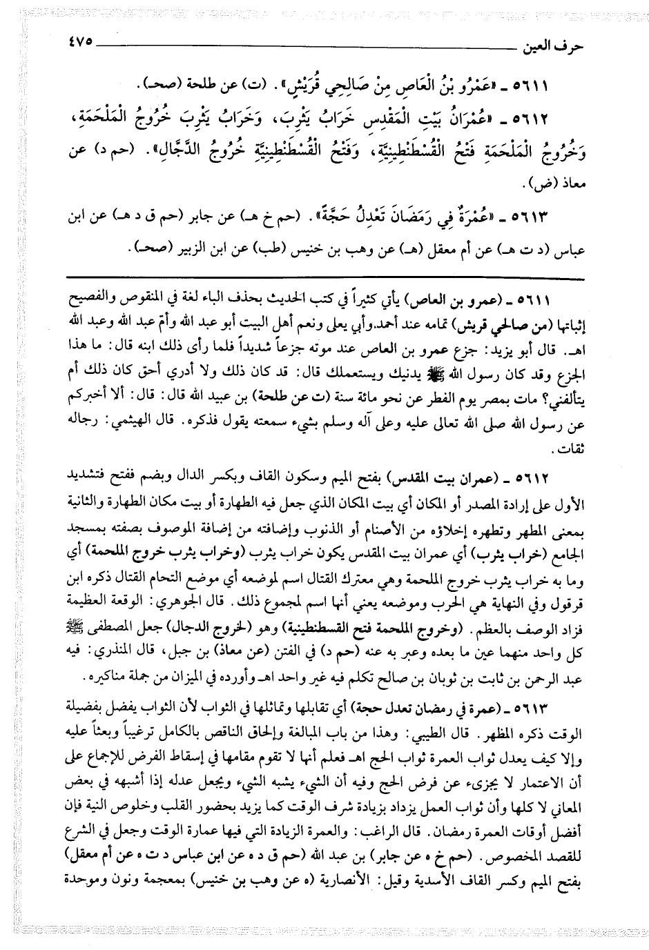 5612 - (عمران بين المقدس) بفتح الميم وسكون القاف وبكسر الدال وبضم ففتح فتشديد الأول على إرادة المصدر أو المكان أي بيت المكان الذي جعل فيه الطهارة أو بيت مكان الطهارة والثانية بمعنى المطهر وتطهره إخلاؤه من الأصنام أو الذنوب وإضافته من إضافة الموصوف بصفته بمسجد