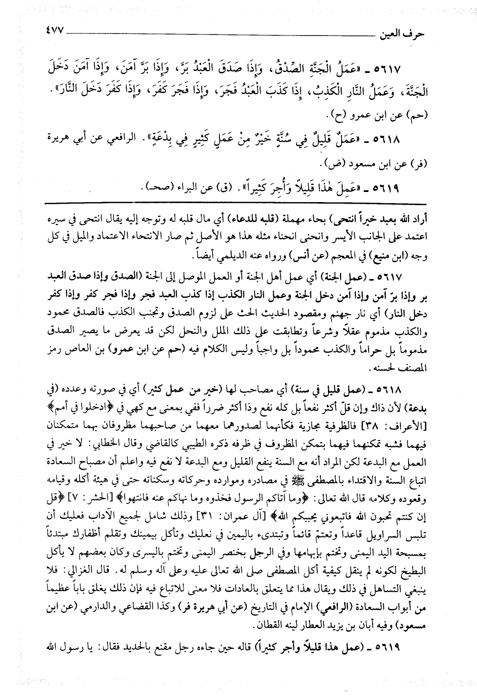 5618 - (عمل قليل في سنة) أي مصاحب لها (خير من عمل كثير) أي في صورته وعدده (في بدعة) لأن ذاك وإن قل أكثر نفعا وذا أكثر ضررا ففي بمعنى مع كهي في * (ادخلوا في أمم) * فالظرفية مجازية فكأنهما لصدورهما معهما من صاحبهما مظروفان بهما متمكنان فيهما تشبه تمكنهما فيهما بتمكن المظروف في ظرفه ذكره الطيبي كالقاضي.