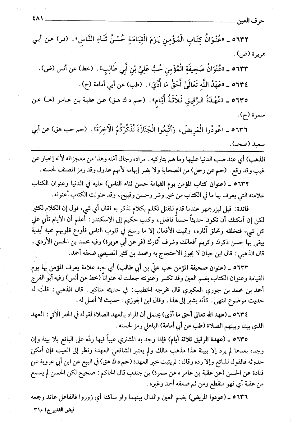 5633 - (عنوان صحيفة المؤمن حب علي بن أبي طالب) أي حبه علامة يعرف المؤمن بها يوم القيامة وعنوان الكتاب بضم العين وقد تكسر وعنونته جعلت له عنوانا.